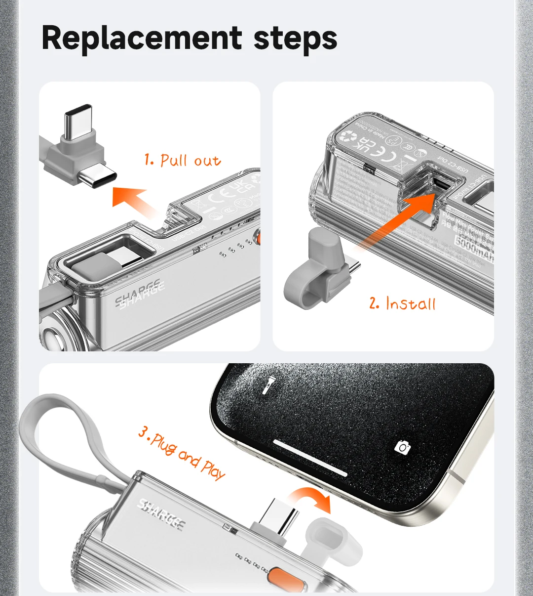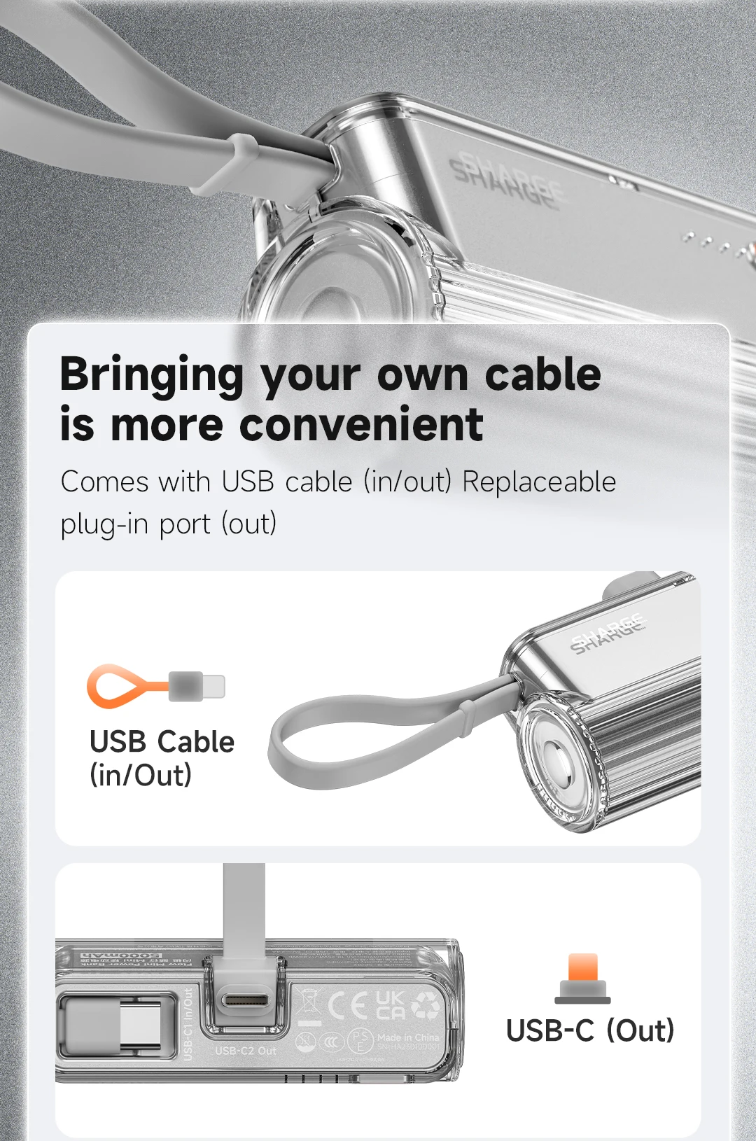 Comes with USB cable (in/out) Replaceable plug-in port (out)
