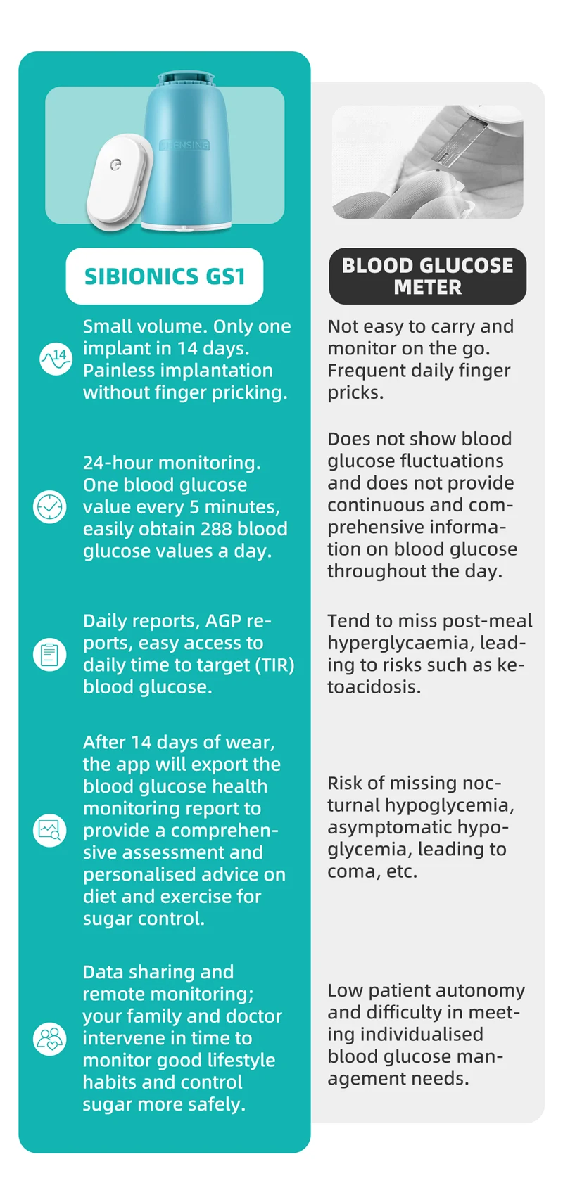 After 14 days of wear the app will export the blood glucose health monitoring report to provide a comprehen-sive assessment and personalised advice on diet and exercise for sugar control.