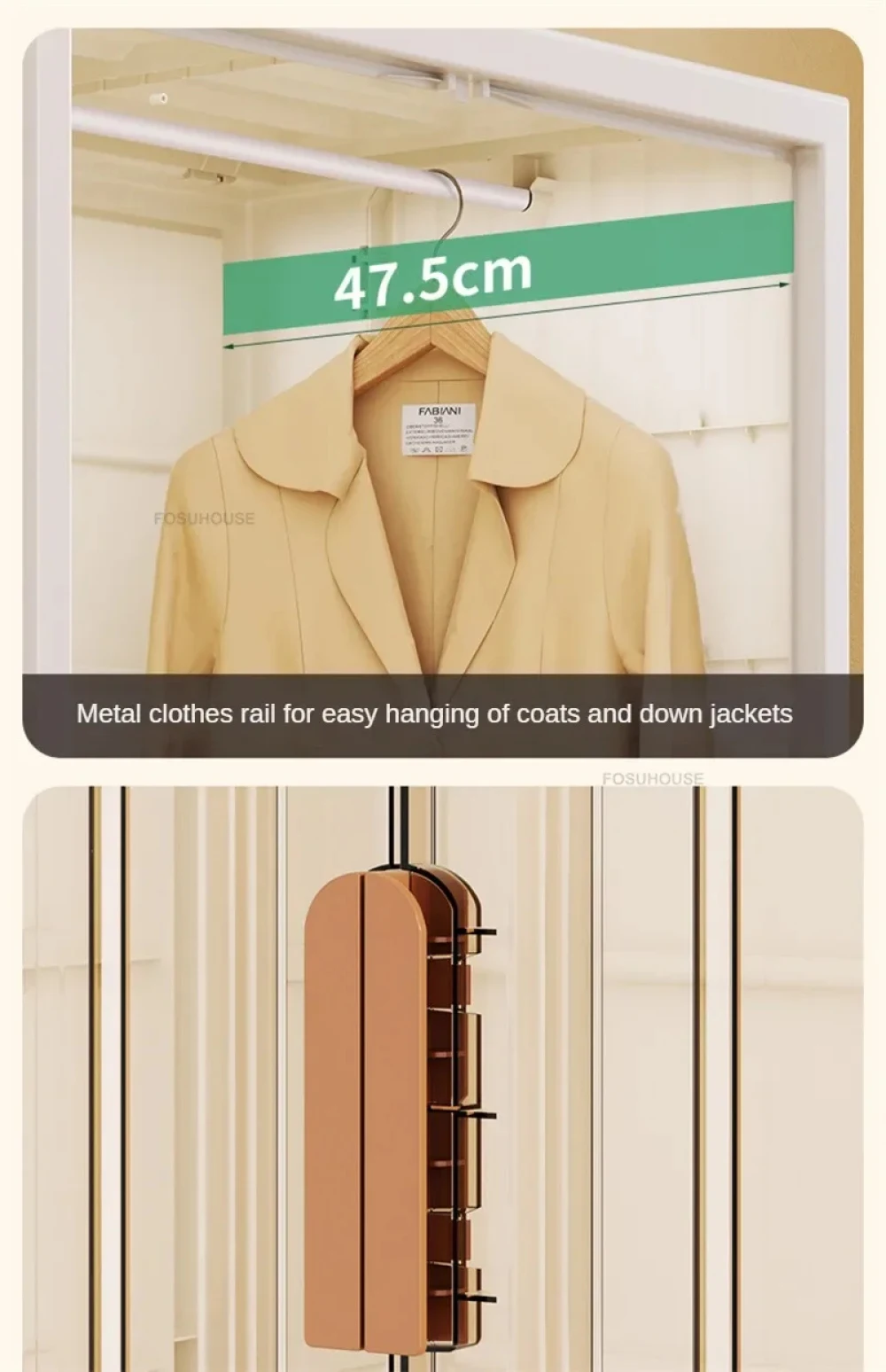 Partitioned Storage: Featuring multiple tiers with partitioned compartments, enabling efficient organization and storage of different types of clothing, ensuring a neat and orderly space.