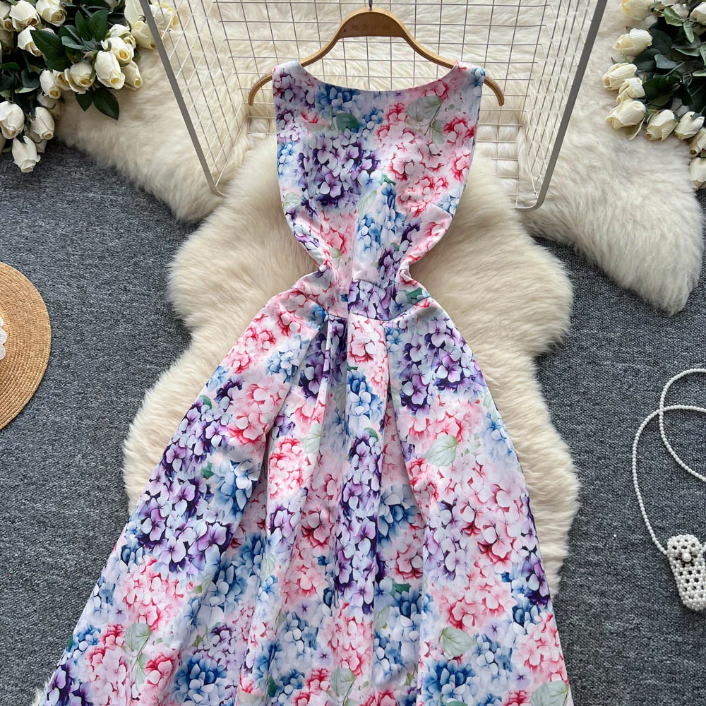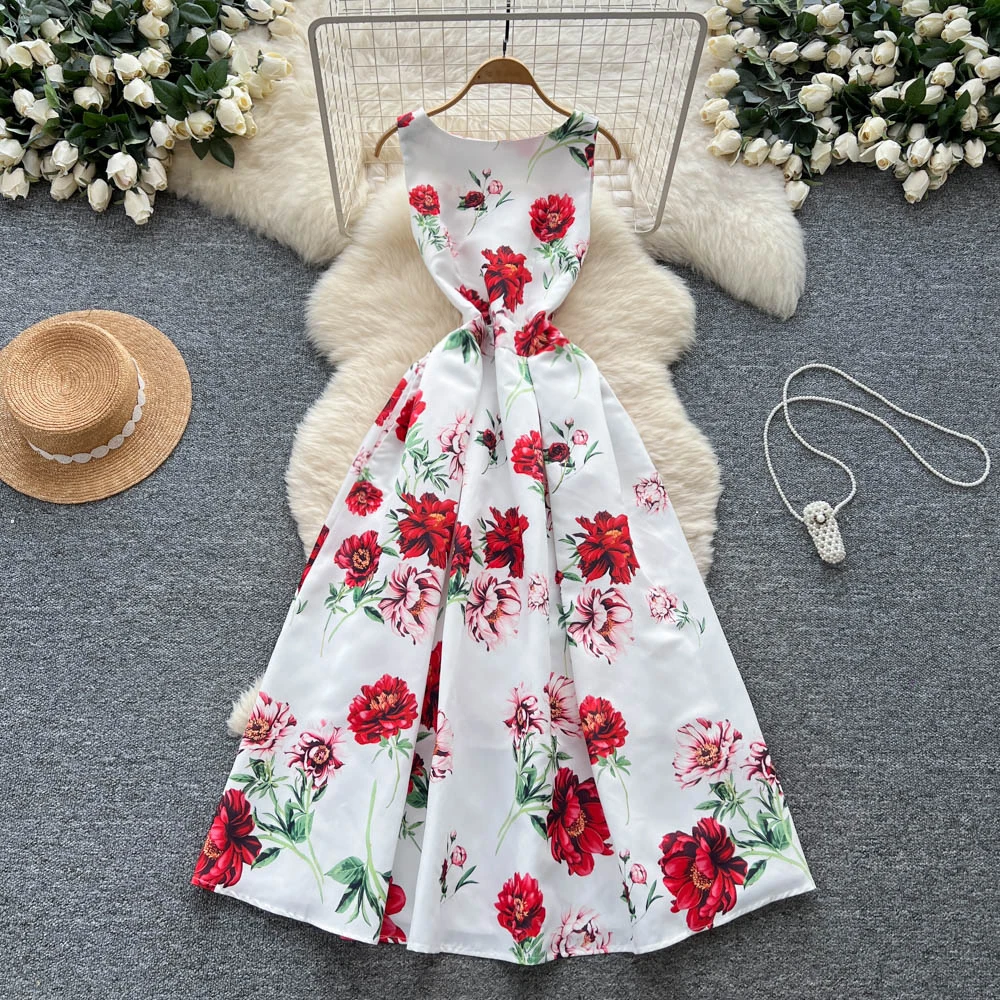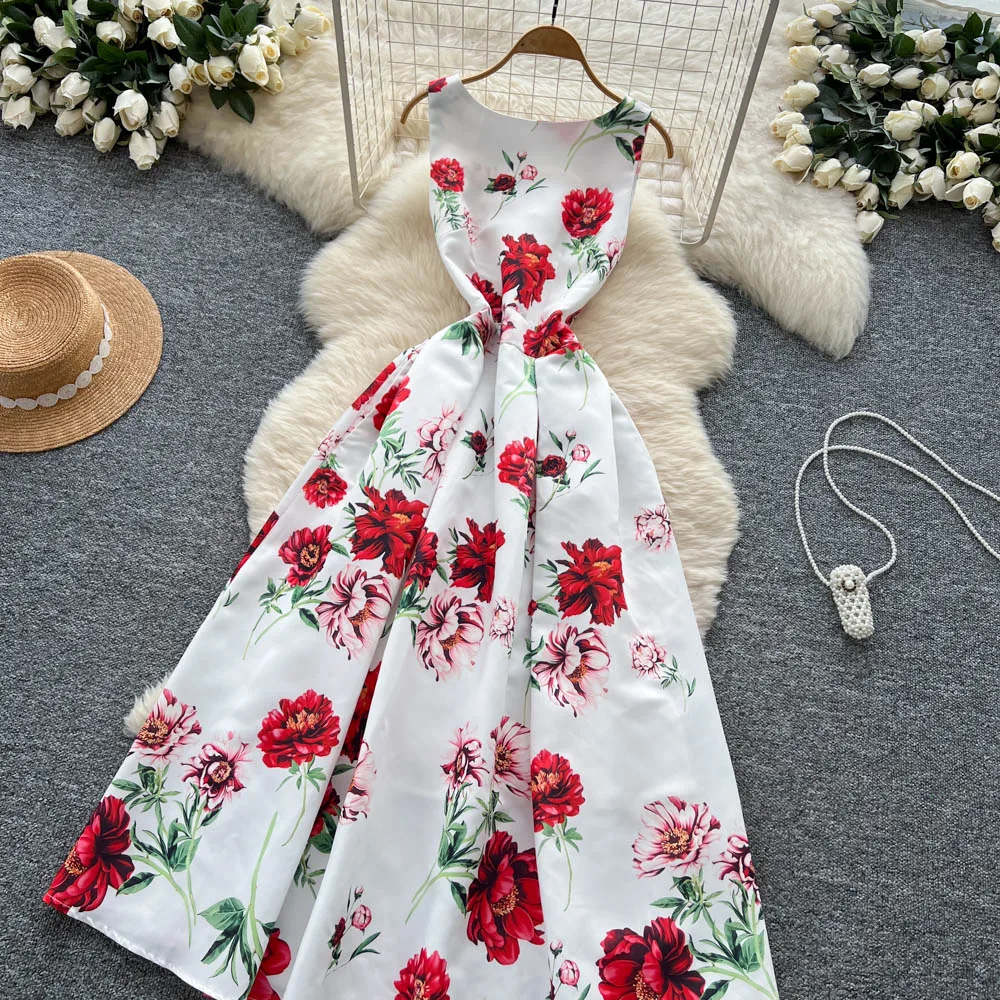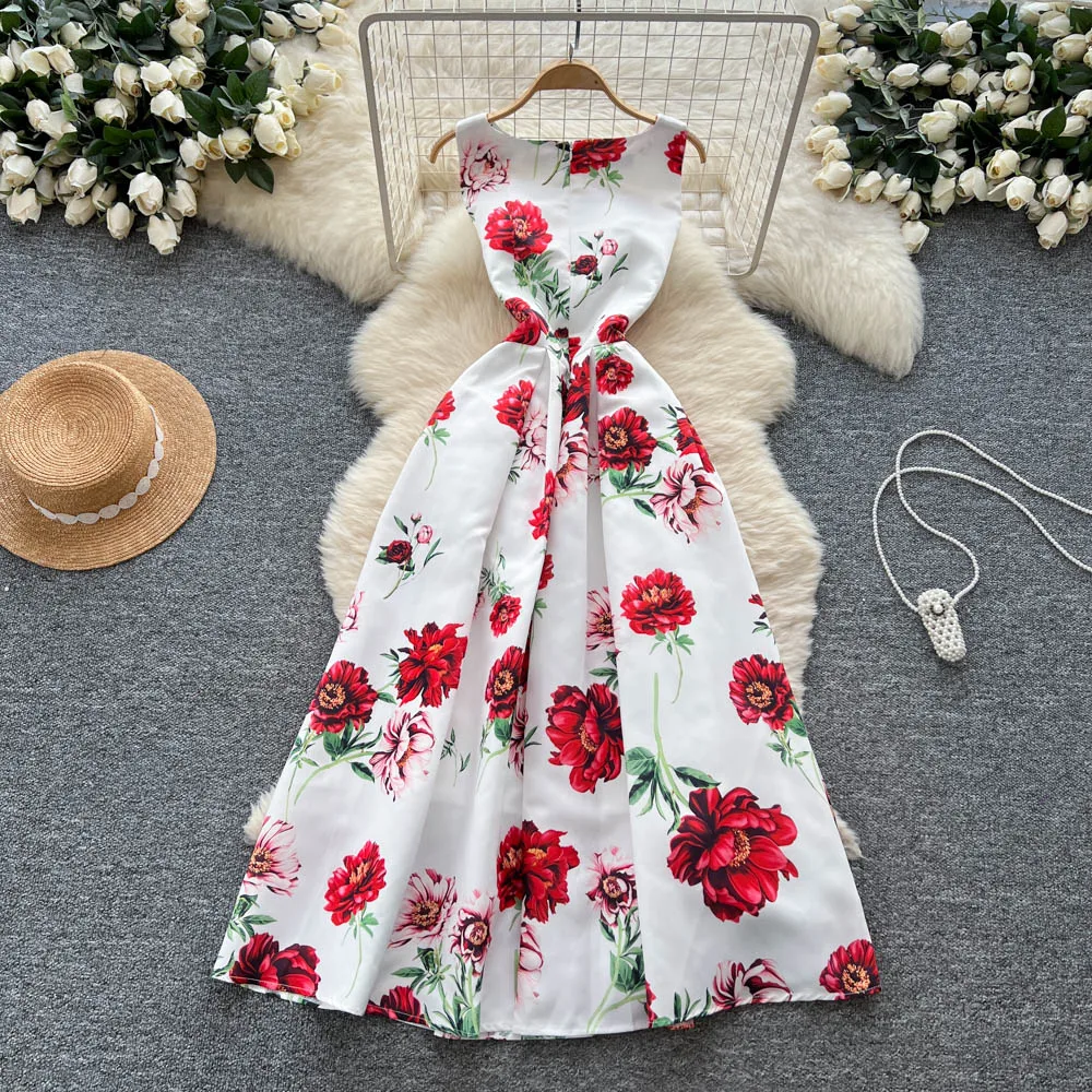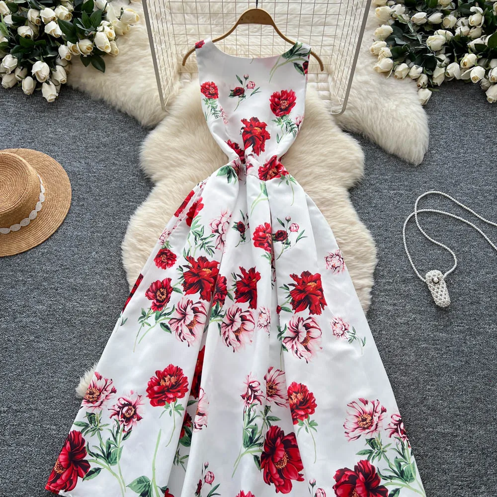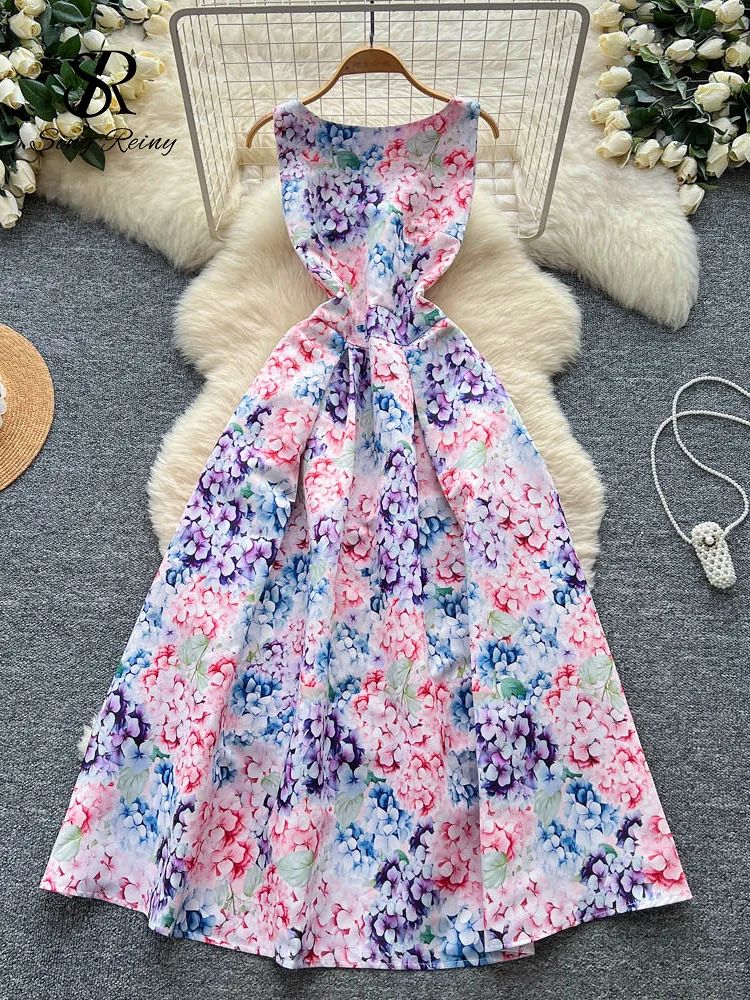 SINGREINY High Quality Bohemian Print Dress Female 2025 O Neck Sleeveless A Line Sundress French Styles Floral Party Long Dress