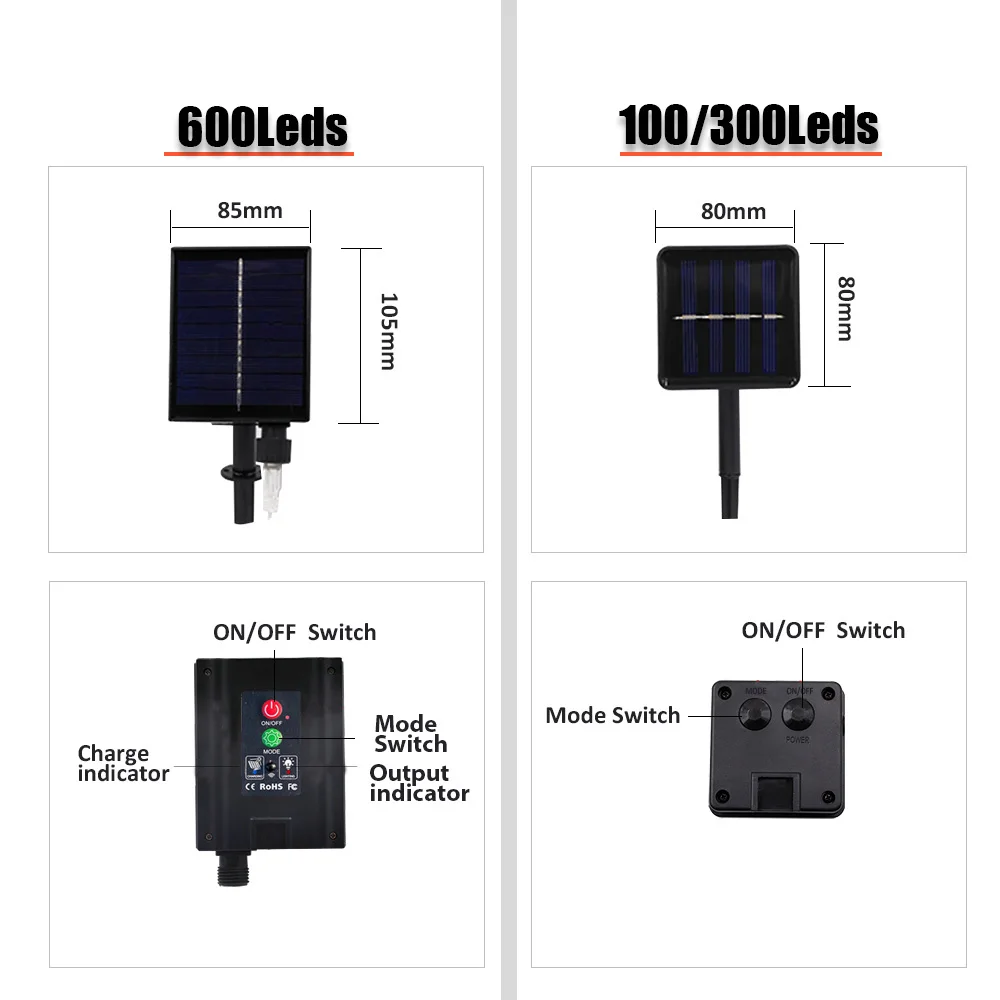 Function : on/off/ flash for 100/300LEDs type , 8 mode flashing and timer for 600LEDs lights .