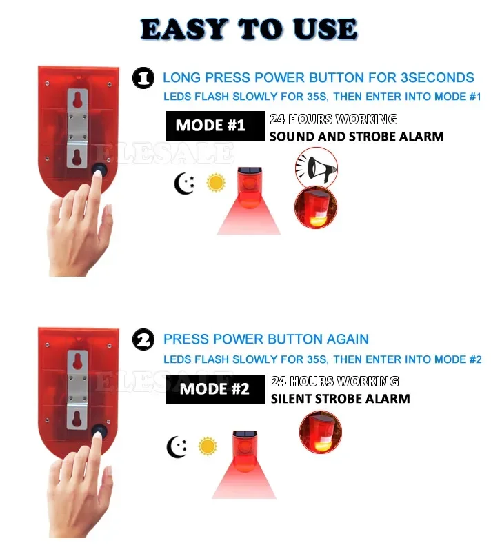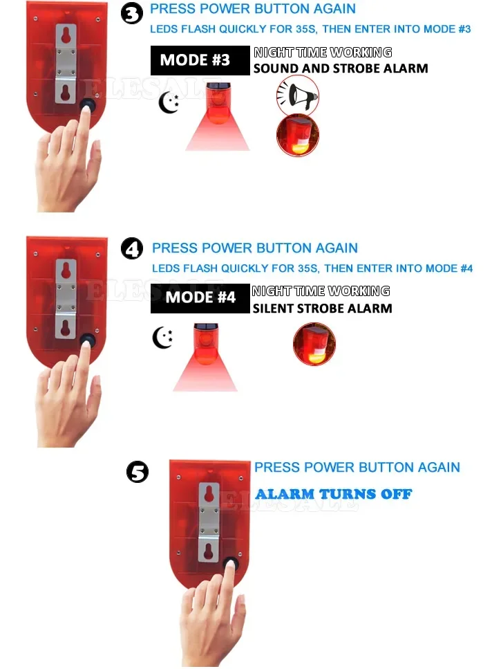 4 WORKING MODE-MODE#1 24 Hours-Sound And Strobe Alarm; MODE#2 24 Hours-Silent Strobe Alarm; MODE#3 Night 12 Hours-Sound And Strobe Alarm; MODE#4 12 Hours-Silent Strobe Alarm
