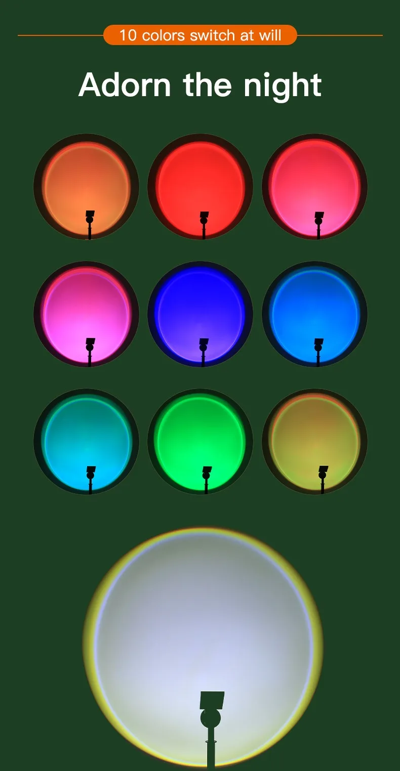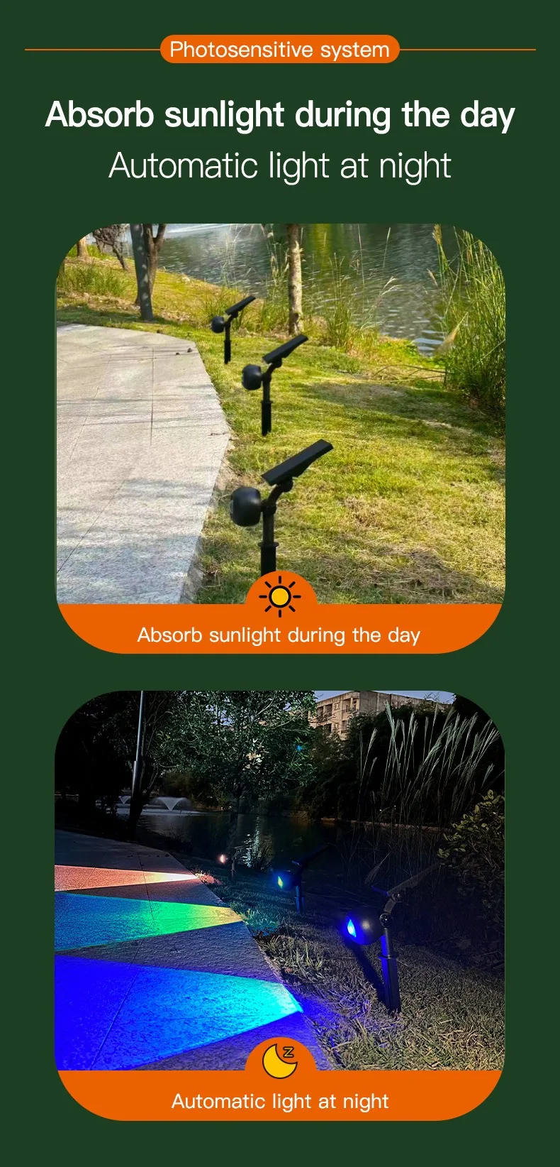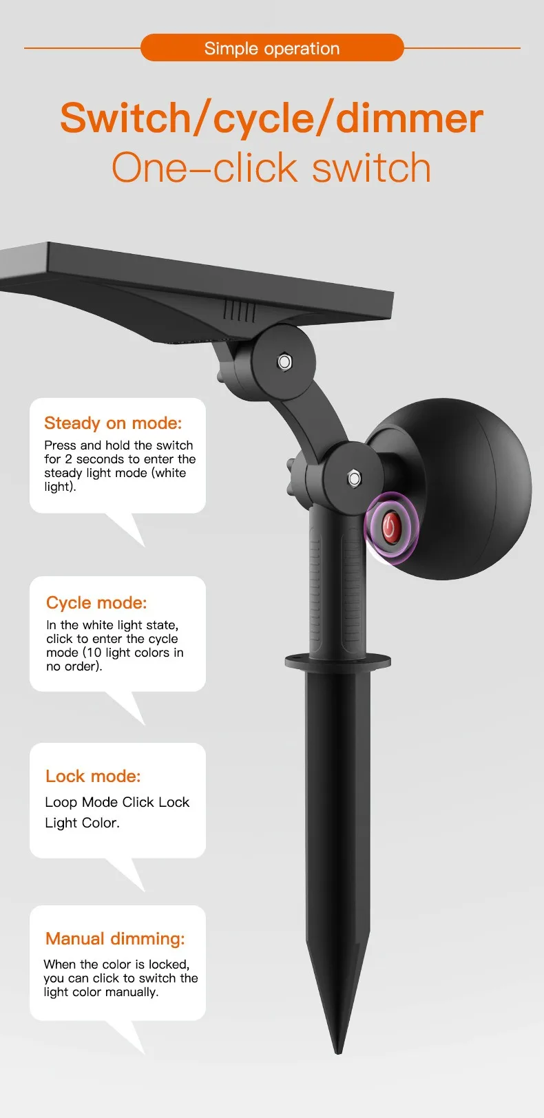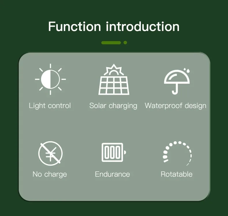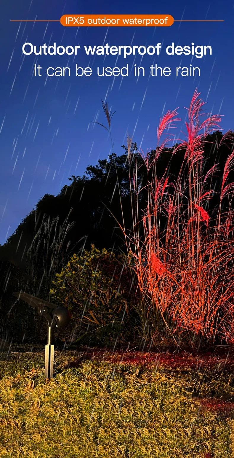 (5) Mode switch: Click and press to turn on the light in white light – rainbow gradient mode – monochrome yellow orange red pink purple blue blue-green green green green turn off, cycling in sequence; (Long press to adjust the brightness of the light when it is on, and the light will flash when adjusted to the brightest or darkest.) Equipped with power-off memory function. During the day, charging with sunlight enters standby mode, and at night, the lights automatically turn on.