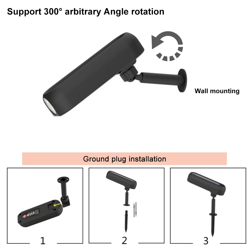 【2 Installation Options】The solar lights with 2 installation options. ① Ground Inserted, ②Wall Mounted. The solar lights can 360° adjustable, you can adjust the spot lights to lighting the area you want.