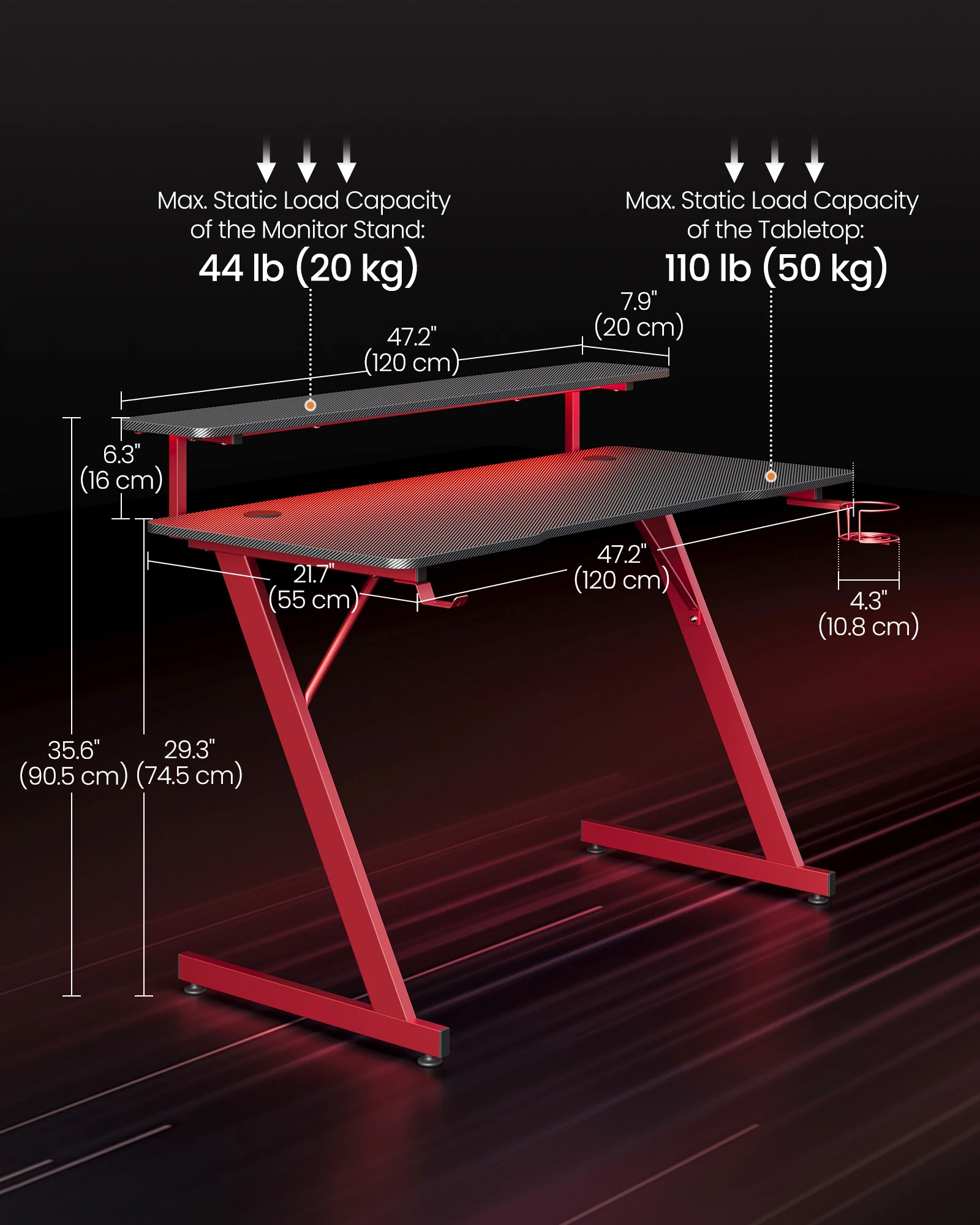 – High Load Capacity: This gaming desk can support up to 50 kg on the top and 20 kg on the monitor stand.