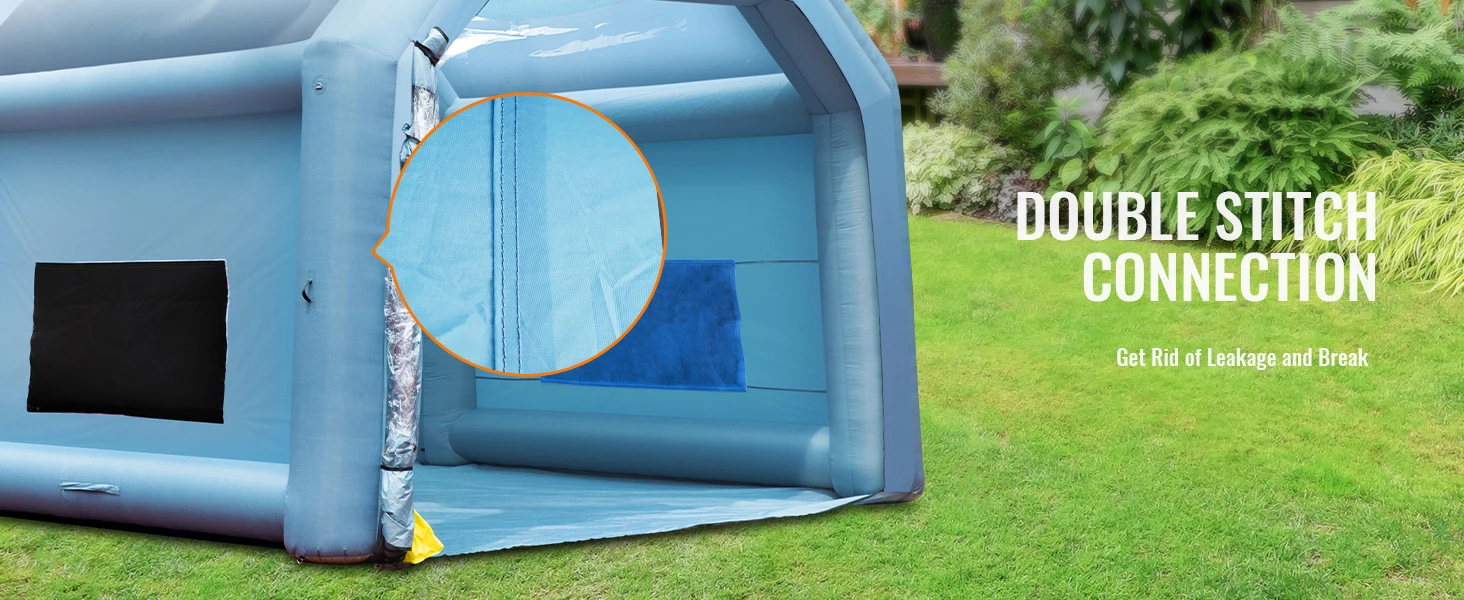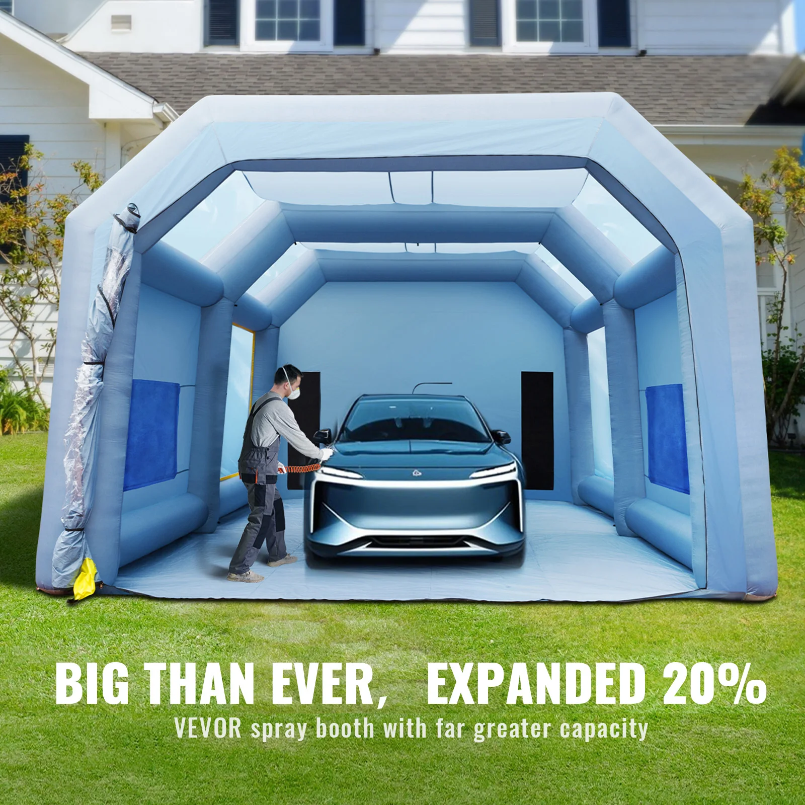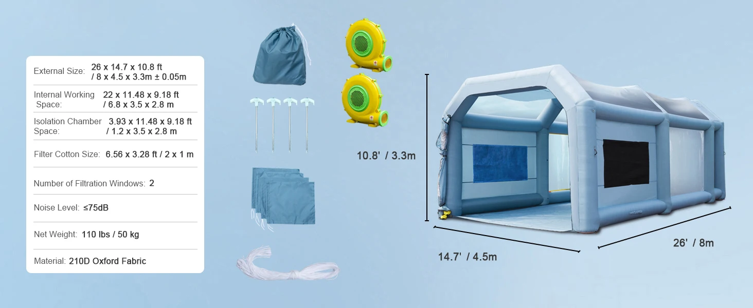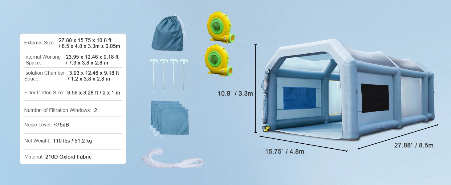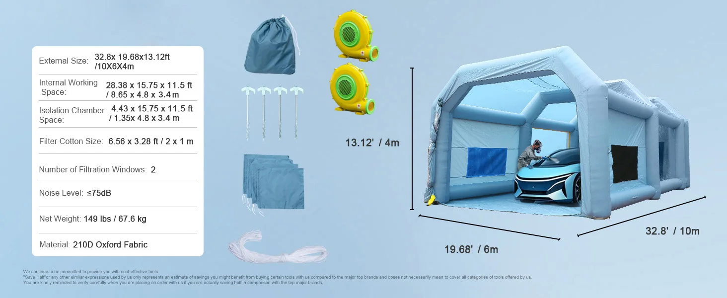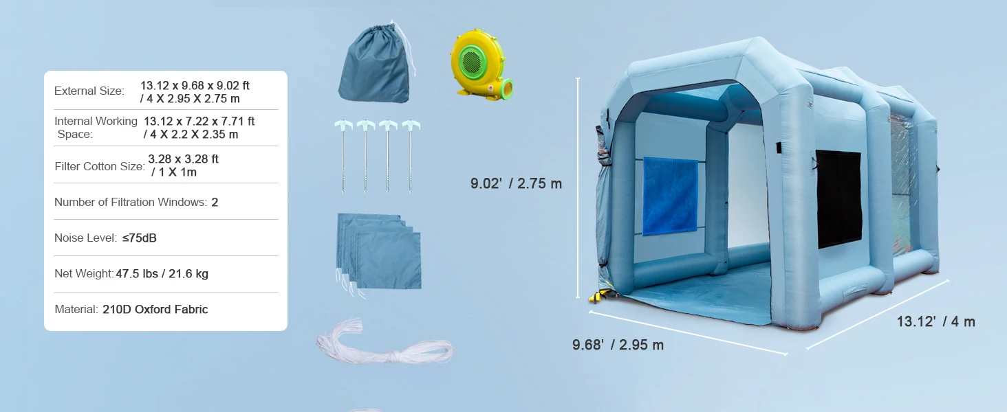 Durable Material: Made from high-quality 201D Oxford fabric and PVC, providing robust protection and longevity. Effective Ventilation: Equipped with a high-efficiency filter system and two blowers for optimal air circulation. Versatile Use: Suitable for various applications, including car painting, furniture refinishing, and more. Spacious Interior: Generous dimensions of 33x20x13ft offer ample space for large projects. Strong Construction: Built to withstand rigorous use with double stitching and waterproof features.