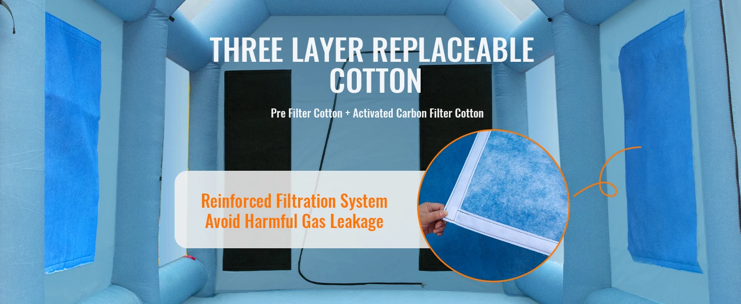 Equipped with a reinforced, replaceable three-layer cotton filter, the tent prevents harmful gas leaks, ensuring a safe and breathable environment during painting tasks.