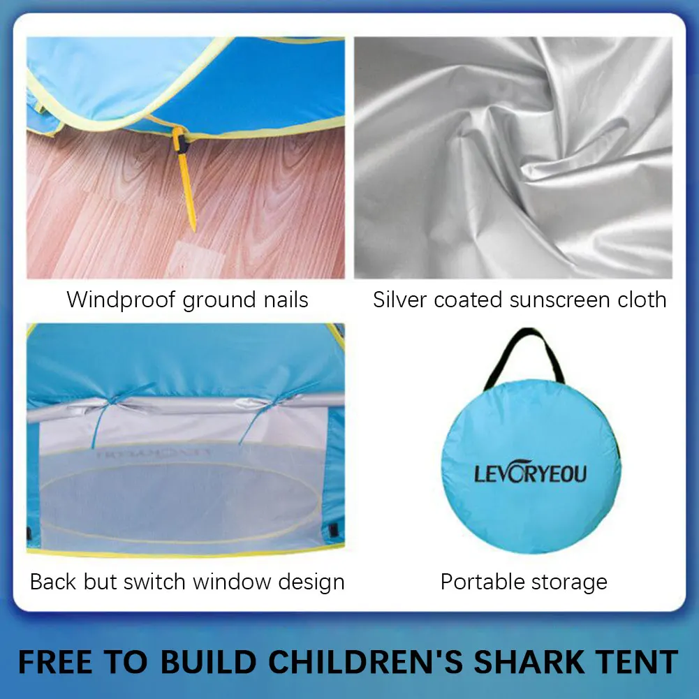 COOL SHARKS DESIGN: Eye catching Sharks tent with pool can allow baby play in the water instead of go to the seasides. The automatic design allows you to set up and fold down the tent in seconds.
