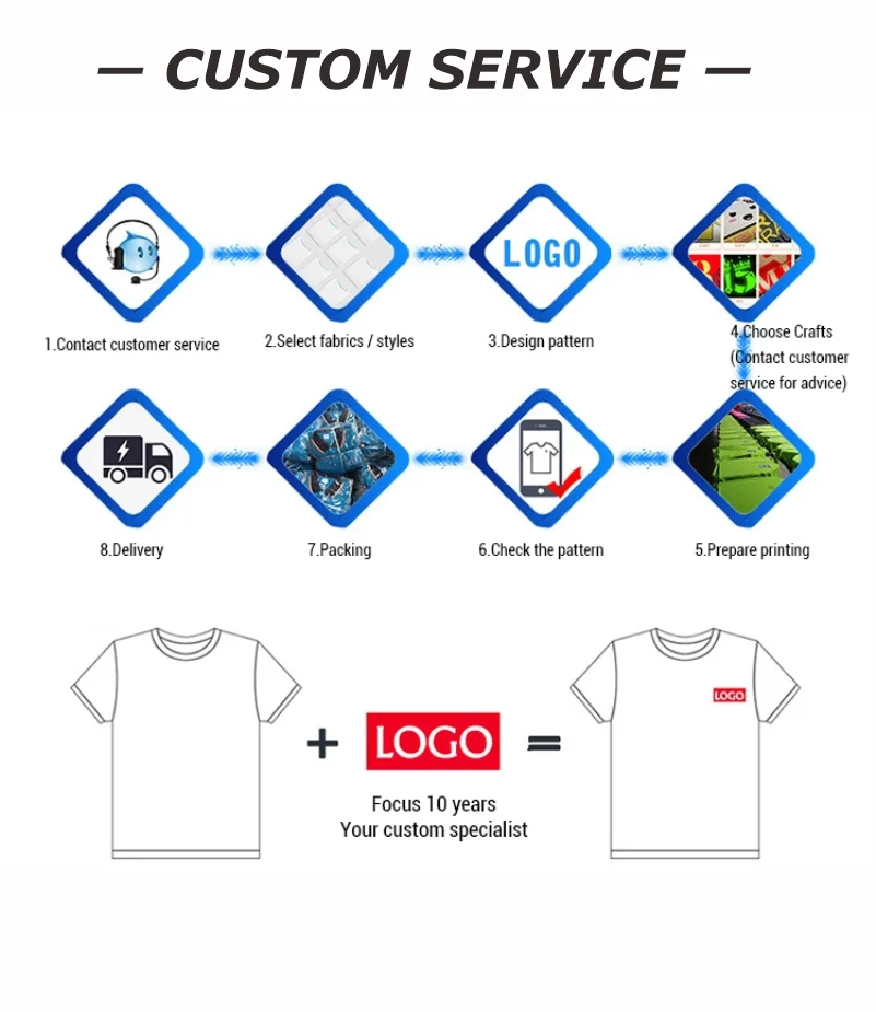 1. Contact us: tell us the color of the clothes you need to customize and the location you need to print, and send your design or logo to the customer service. We will provide you with an email, and we will send you the effect picture. After you check, you can place an order for payment, and We will ship in about 5 days.1 dollar for 1 position, no limit on pattern size.