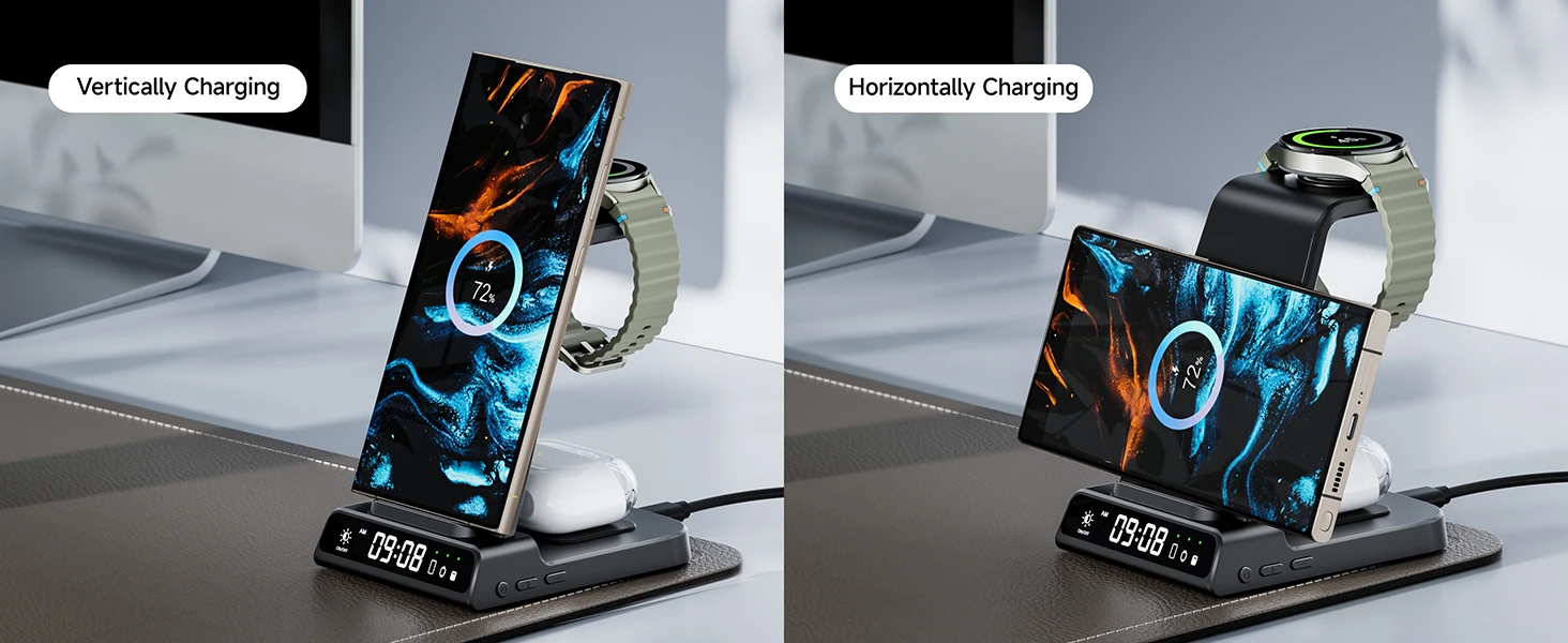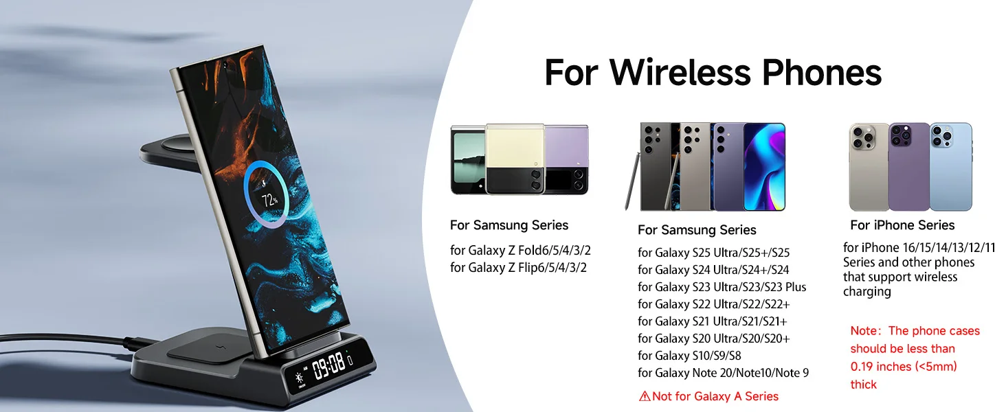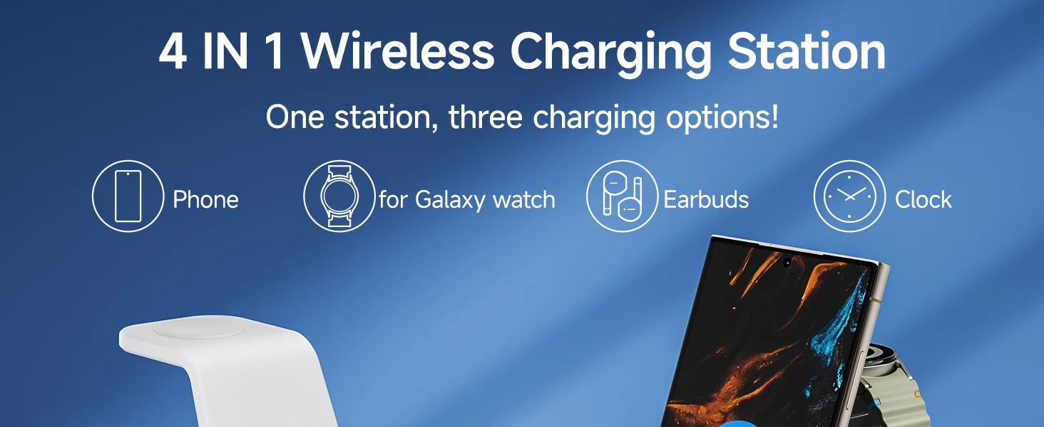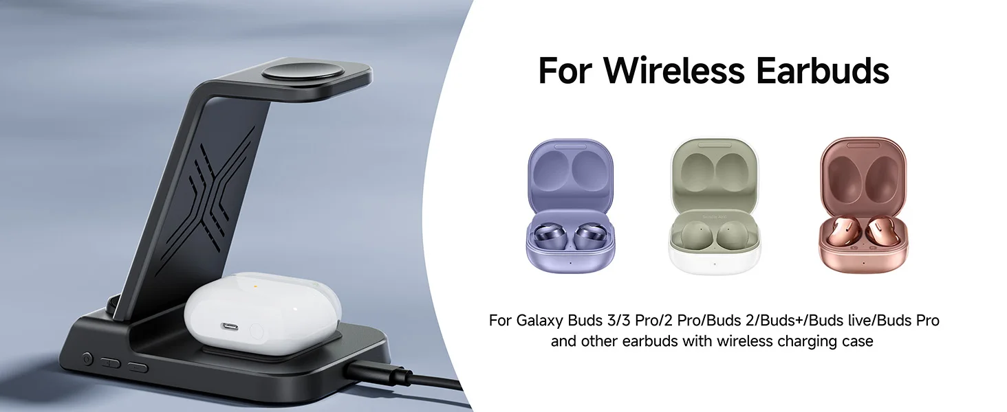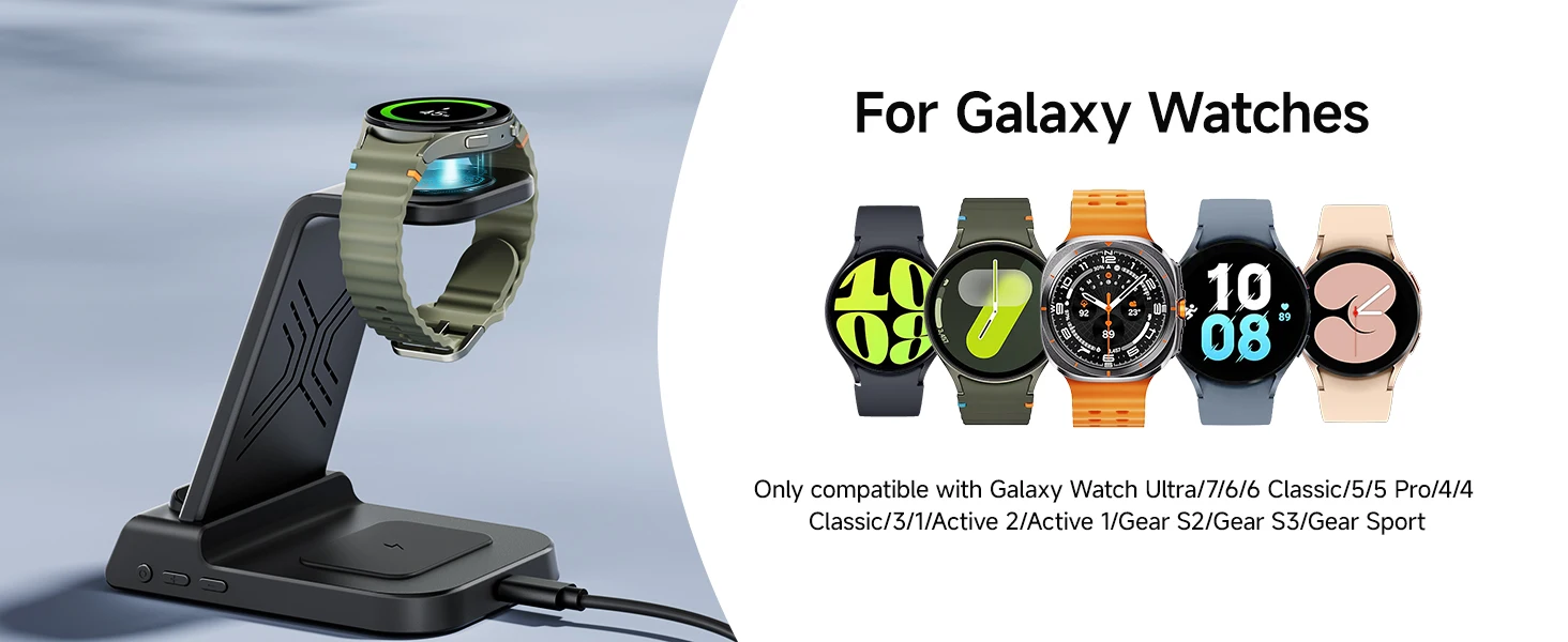 - Compatible Devices: Samsung Galaxy Z Fold 7, Z Flip 7, S25 Ultra, S25+, S25, Z Flip 6, Z Fold 6, Galaxy Watch 7, Galaxy Watch Ultra, S24 Ultra, S24+, S24, Galaxy Watch 8 Classic, Galaxy Watch 8, Galaxy Watch 6, Galaxy Watch 6 Classic, Galaxy Watch 5, Galaxy Watch 5 Pro, Galaxy Watch 4, Galaxy Watch 4 Classic, Galaxy Watch Active 2, Galaxy Watch Active 1, Galaxy Watch 1, Galaxy Watch 3, Galaxy S23 Ultra, Z Fold 5, Z Flip 5, S23+, S23, S23, Z Fold 4, Z Flip 4, S22 Ultra, S22, S22+, S21 FE, Z Fold 3, Z Flip 3, S21, S21 Ultra, S20, S20 Ultra, S10, Note 20, Note 10, Note 9, and more; iPhone 15, 14, 13, 12, 11 Series, SE, XS MAX, X, XR, 8, 8 Plus; Google Pixel 8 Pro, Pixel 8, and other Qi-enabled phones; Galaxy Buds 3 Pro, Buds 3, Buds 2 Pro, Buds Pro, Buds, Buds+, Buds Live; AirPods Pro 2, AirPods 3rd Generation, AirPods 2, AirPods Pro, and all other wireless charging-compatible earbuds cases.