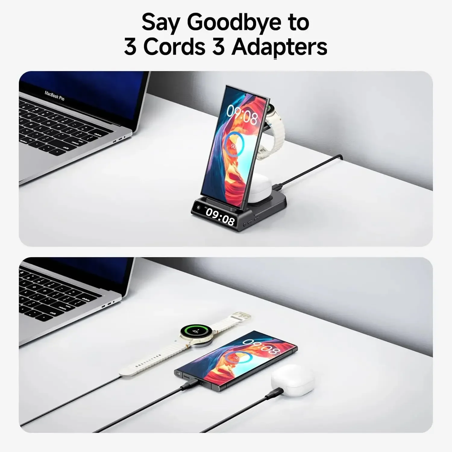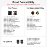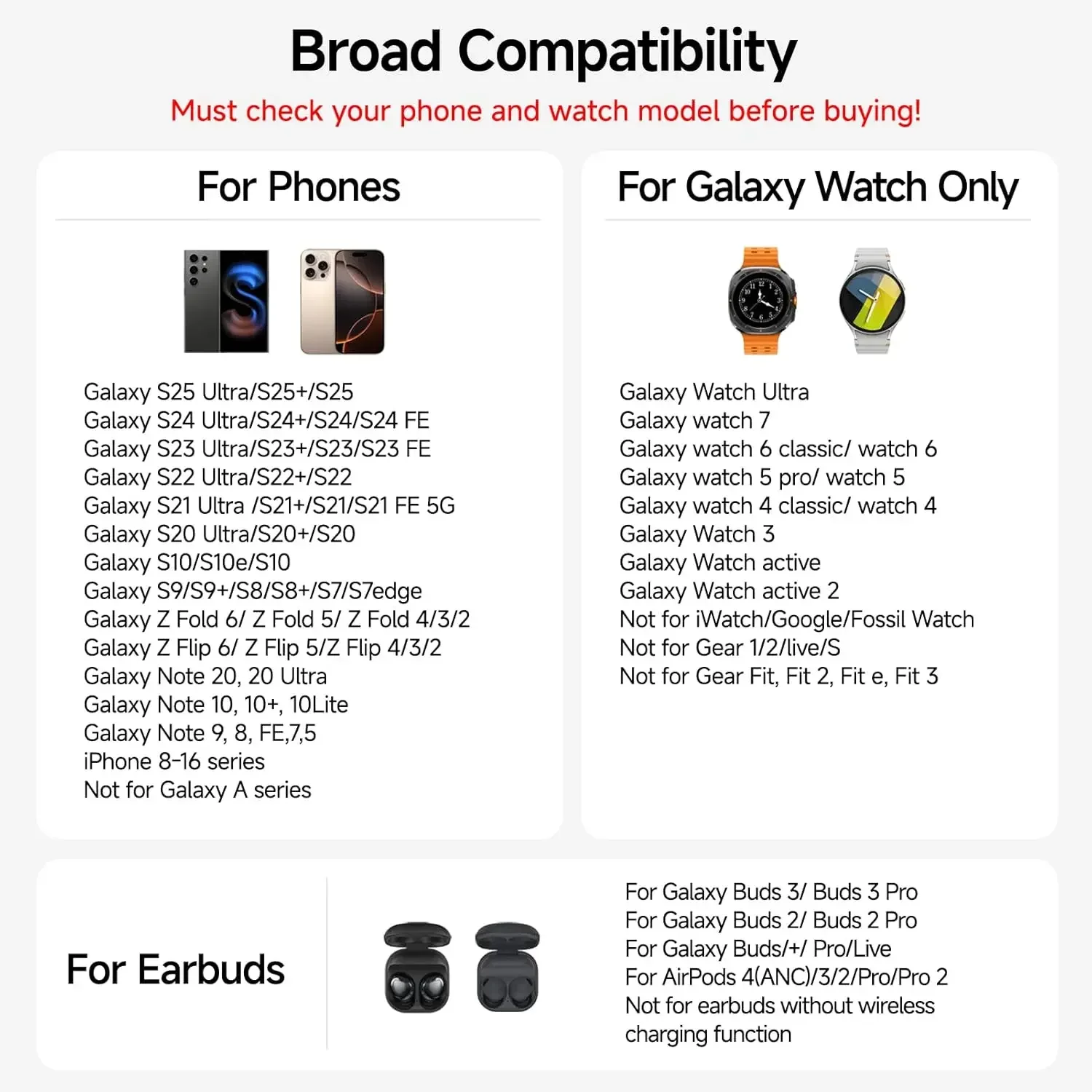 - Compatible Devices: Samsung Galaxy Z Fold 7, Z Flip 7, S25 Ultra, S25+, S25, Z Flip 6, Z Fold 6, Galaxy Watch 7, Galaxy Watch Ultra, S24 Ultra, S24+, S24, Galaxy Watch 8 Classic, Galaxy Watch 8, Galaxy Watch 6, Galaxy Watch 6 Classic, Galaxy Watch 5, Galaxy Watch 5 Pro, Galaxy Watch 4, Galaxy Watch 4 Classic, Galaxy Watch Active 2, Galaxy Watch Active 1, Galaxy Watch 1, Galaxy Watch 3, Galaxy S23 Ultra, Z Fold 5, Z Flip 5, S23+, S23, S23, Z Fold 4, Z Flip 4, S22 Ultra, S22, S22+, S21 FE, Z Fold 3, Z Flip 3, S21, S21 Ultra, S20, S20 Ultra, S10, Note 20, Note 10, Note 9, and more; iPhone 15, 14, 13, 12, 11 Series, SE, XS MAX, X, XR, 8, 8 Plus; Google Pixel 8 Pro, Pixel 8, and other Qi-enabled phones; Galaxy Buds 3 Pro, Buds 3, Buds 2 Pro, Buds Pro, Buds, Buds+, Buds Live; AirPods Pro 2, AirPods 3rd Generation, AirPods 2, AirPods Pro, and all other wireless charging-compatible earbuds cases.