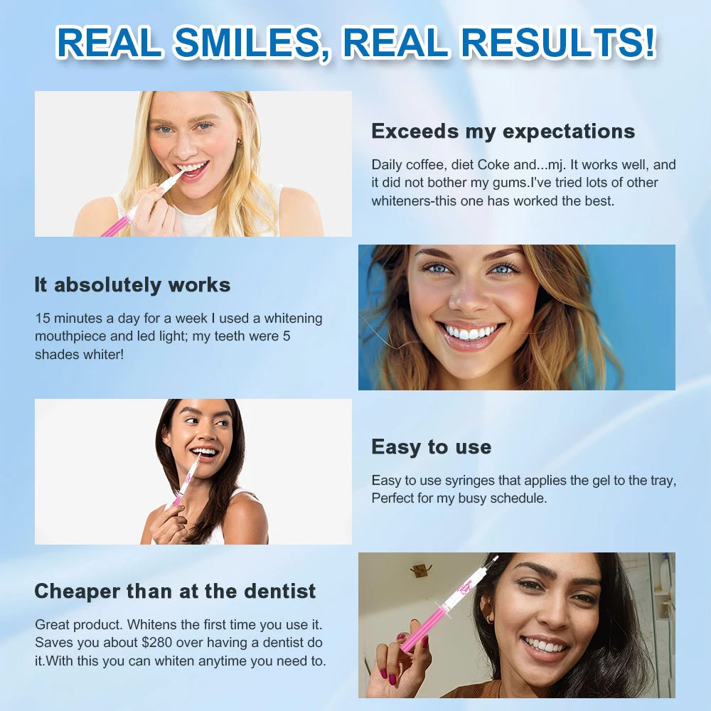 Our teeth whitening gel is formulated with safe, gentle ingredients that won’t harm enamel or irritate gums. It's perfect for those with sensitive teeth looking for a whitening solution that’s both effective and gentle.