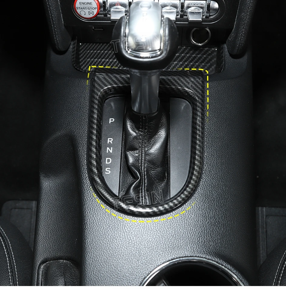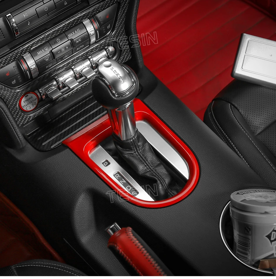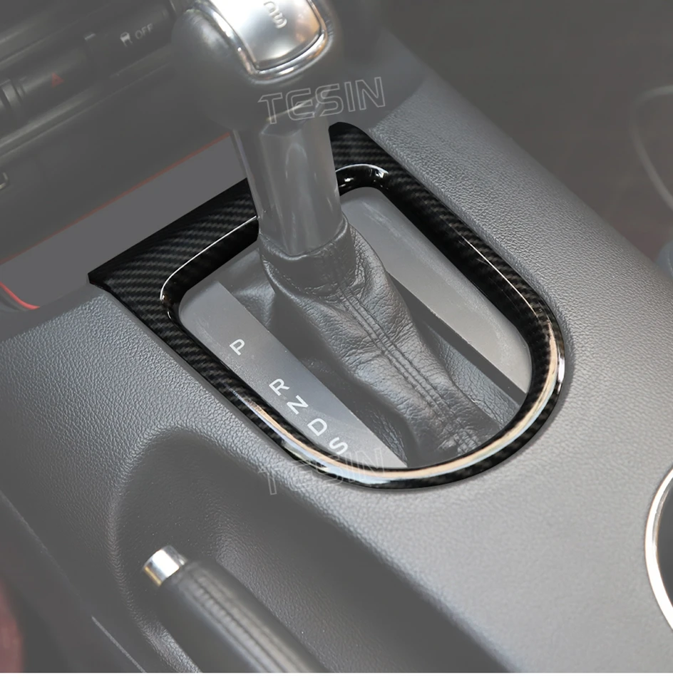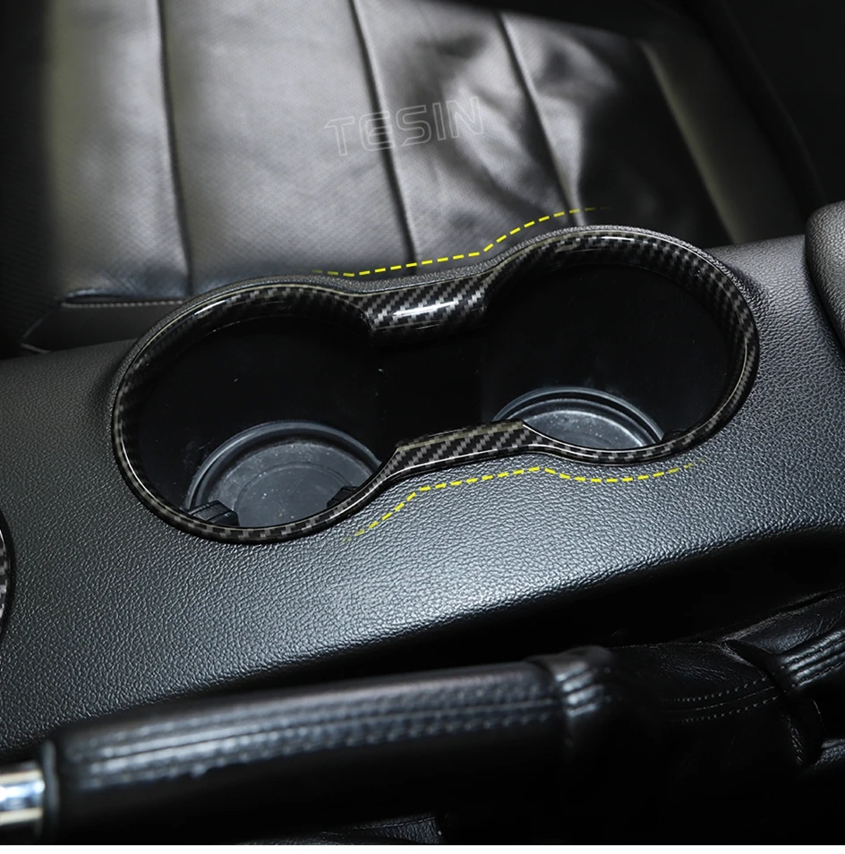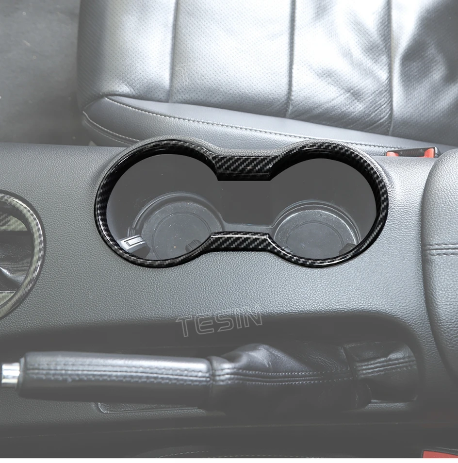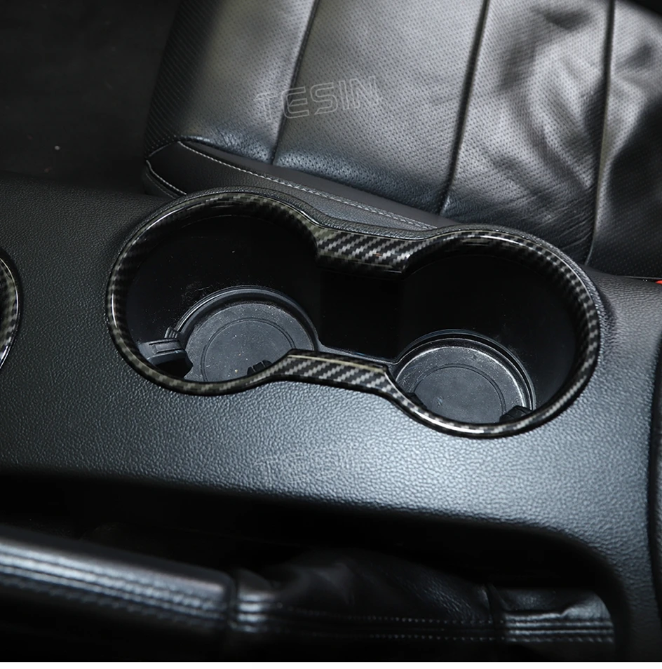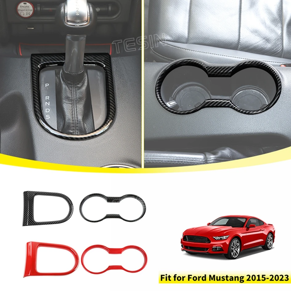 TESIN for Ford Mustang 2015-2023 Carbon Fiber Grain Car Interior Front Water Cup Holder Gear Shift Decoration Cover Trim Sticker