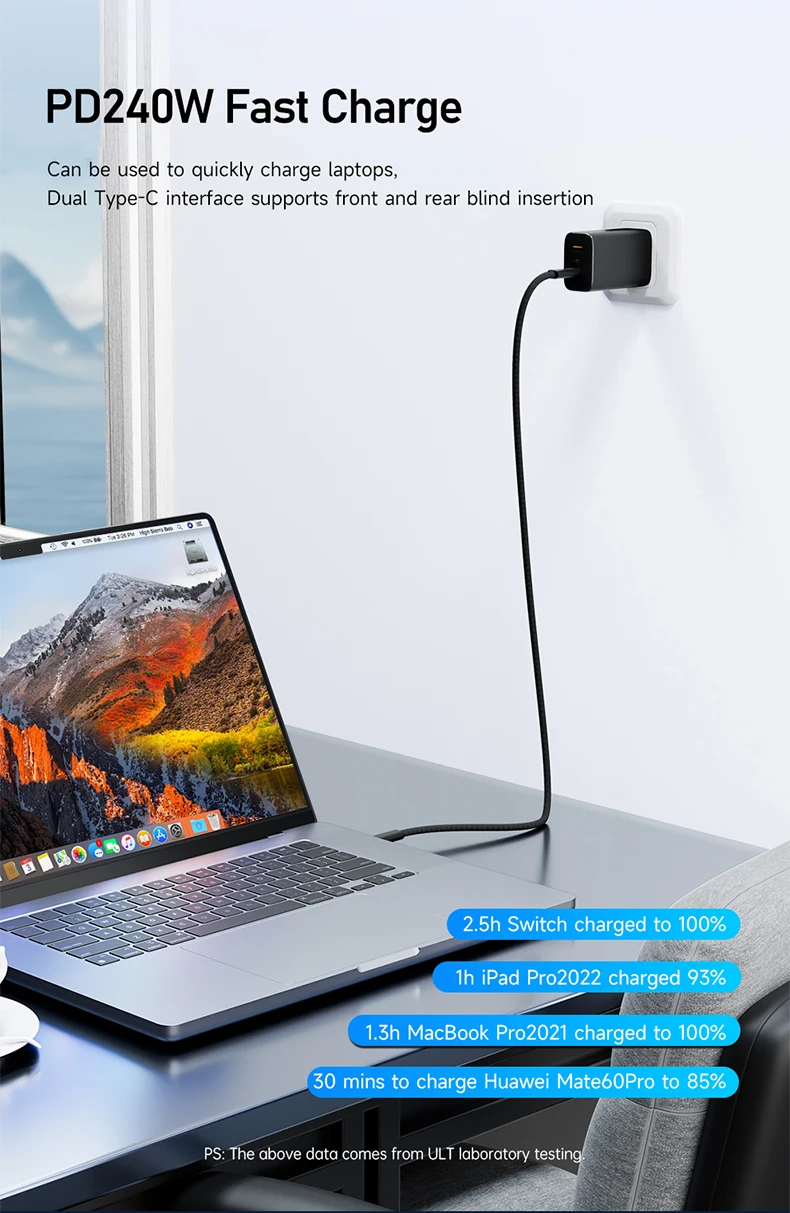 Powerful: lab certified to safely deliver up to 240 watts to charge the most power-hungry notebook computer.