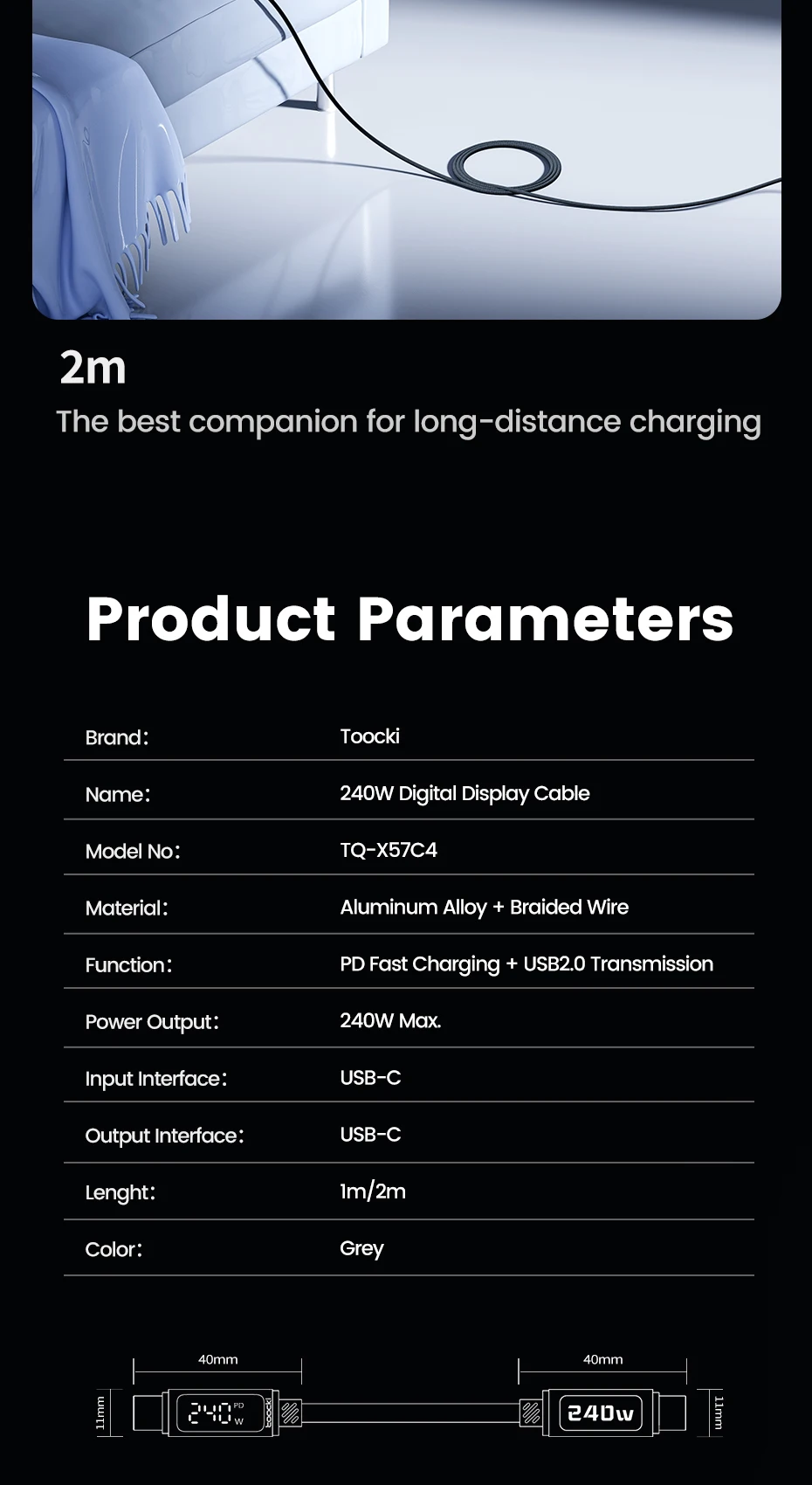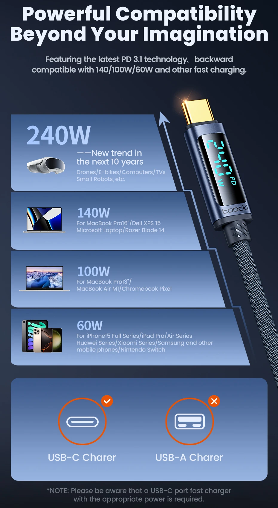 Toocki 240W USB C Cable PD 3.1 Super Charge Type C To Type C Display Cable For iPhone 15 16 Pro Max Xiaomi Samsung S23 Macbook
