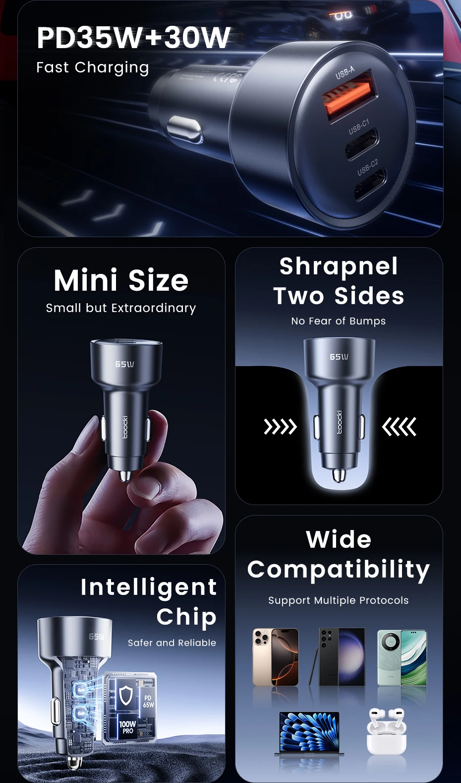 Be the first to review “Toocki 65W USB C Car Charger 3 Ports Type C Fast Charge PPS PD3.0 QC Car Phone Charger For iPhone 16 Xiaomi Huawei Samsung”
