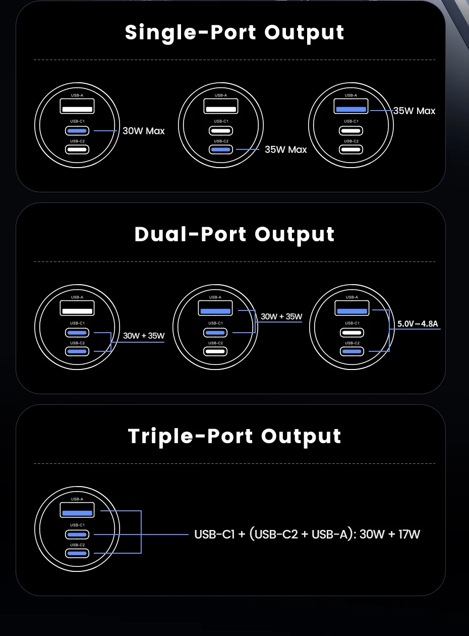 USB-C1 + (USB-C2 + USB-A) Output: 30W + 17W