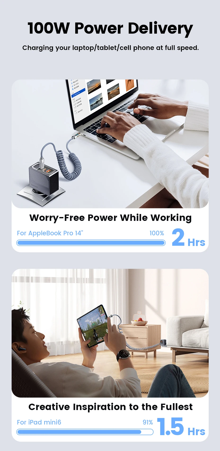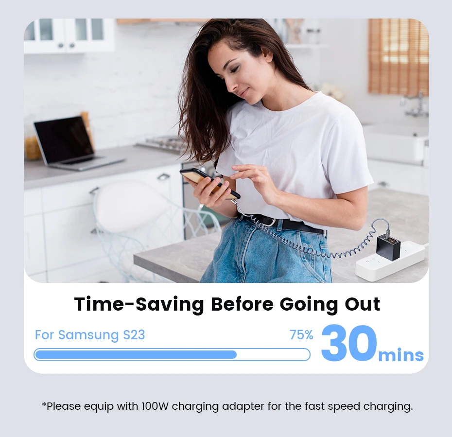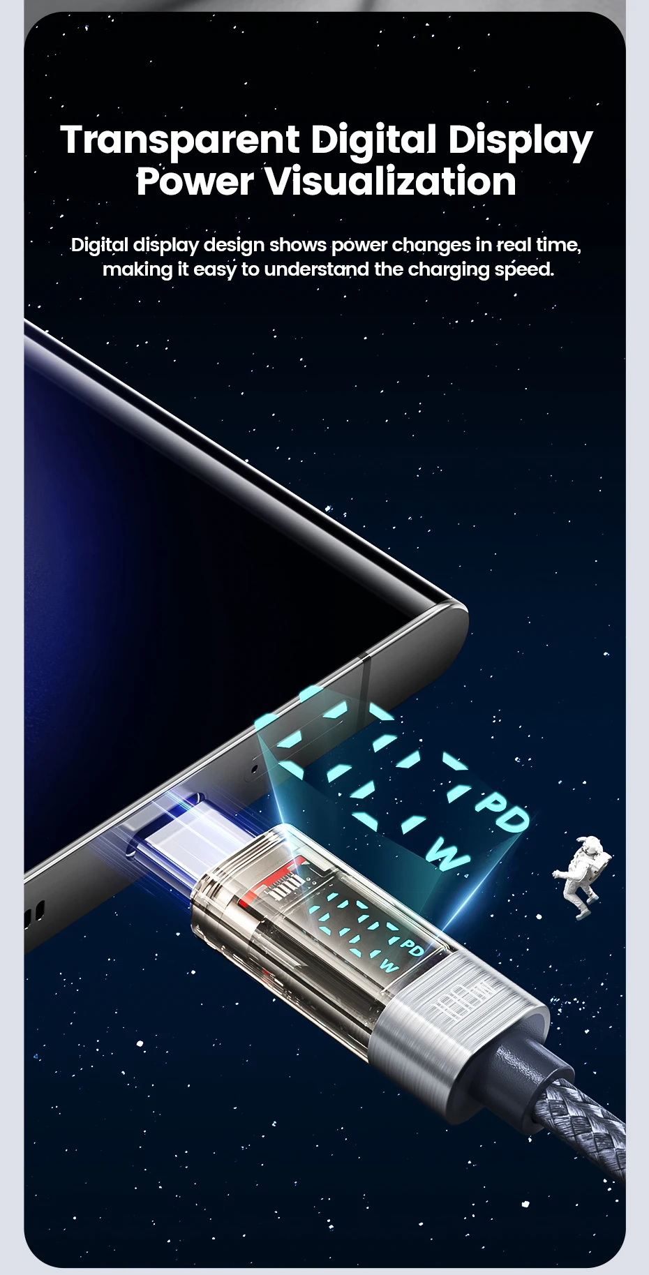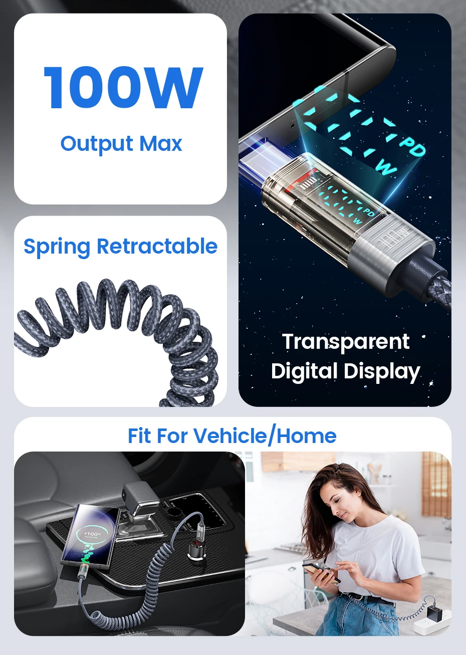 [PD 100W Spring Digital Cable] USB-C to USB-C 100W Output Max Spring Retractable Transparent Digital Display Fit For Vehicle/Home