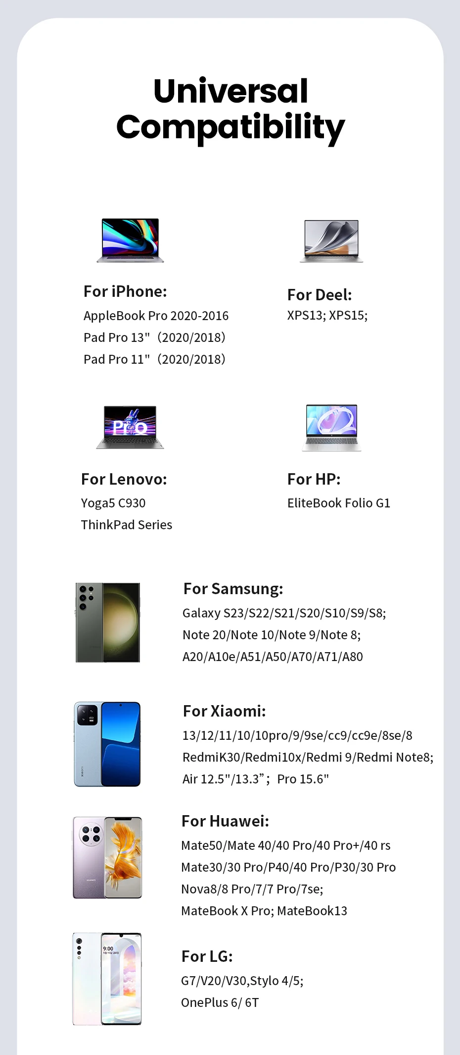 For Huawei: Mate50/Mate 40/40 Pro/40 Pro+/40 rs/Mate30/30 Pro/P4040 Pro/P30/30 Pro/Nova8/8 Pro7/7 Pro7se; MateBook X Pro; MateBook13 LG:G7/V20/V30,Stylo 4/5; OnePlus 6/ 6T m For LG:G7/V20/V30,Stylo 4/5; OnePlus 6/ 6T For Lenovo:Yoga 5 C930; ThinkPad; IdealPad 720S 13 For Dell:XPS13;XPS15 For HP::EliteBook Folio G1 Others:Nintendo Switch;Switch Lite