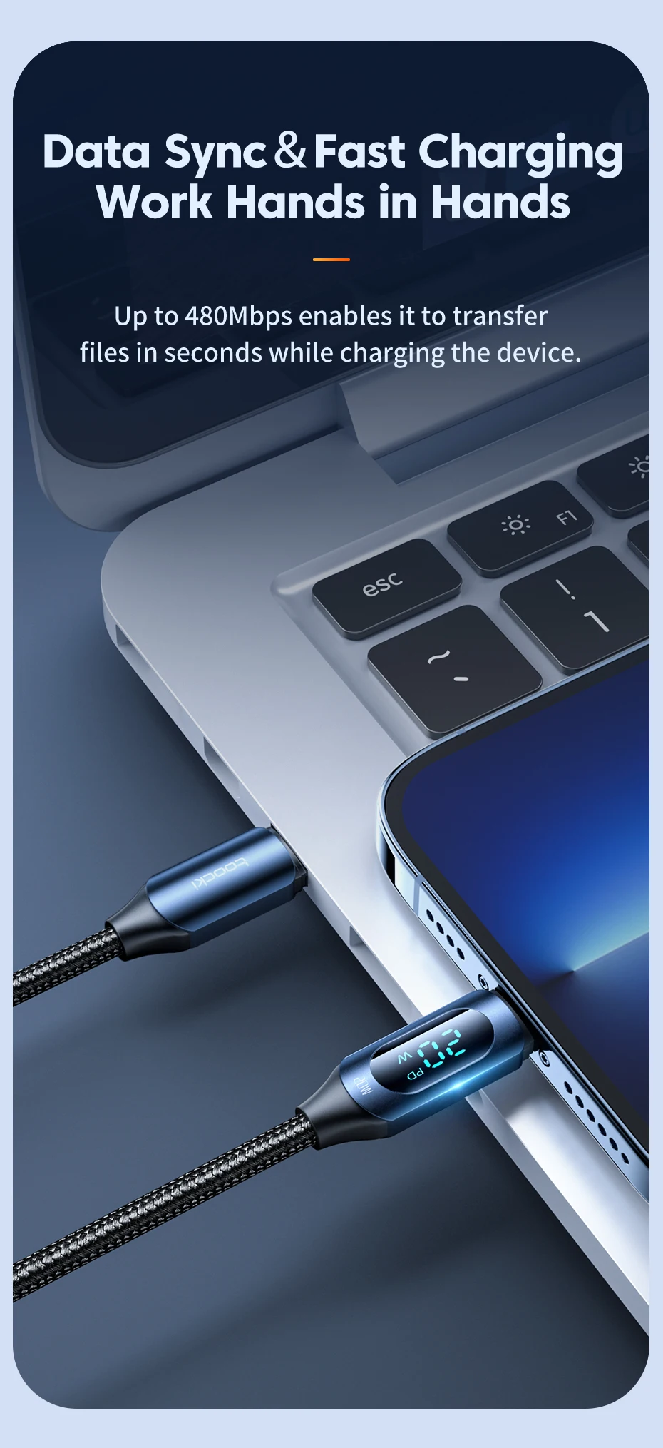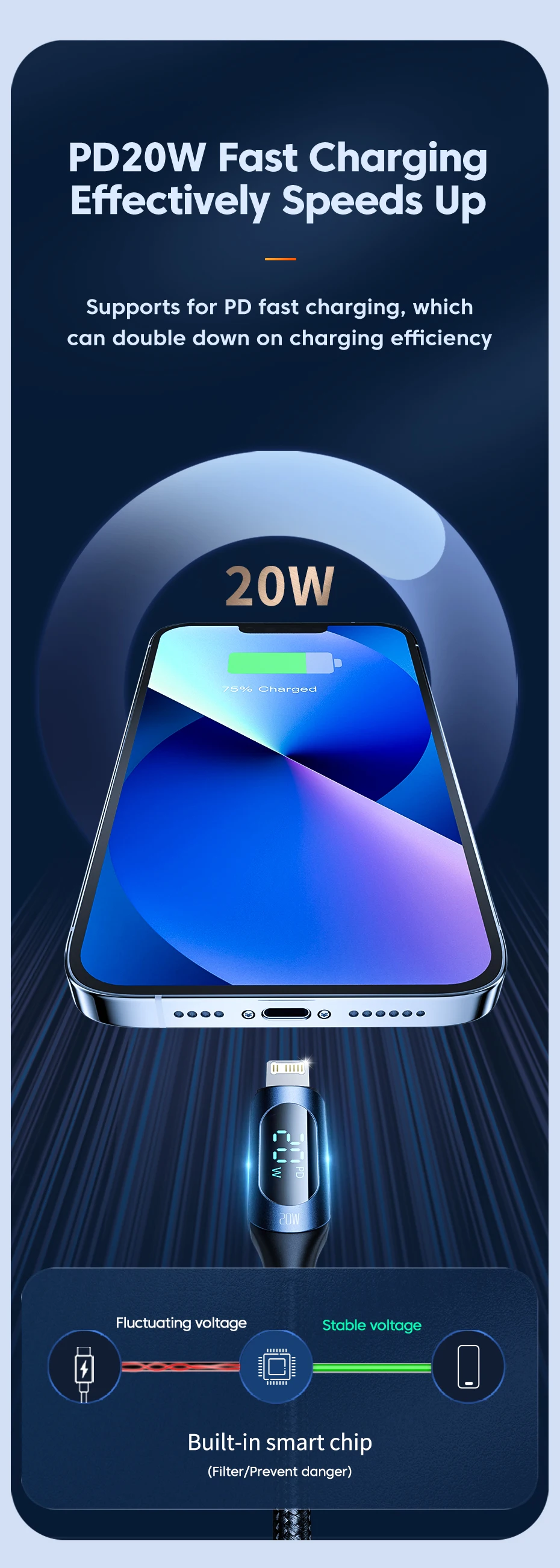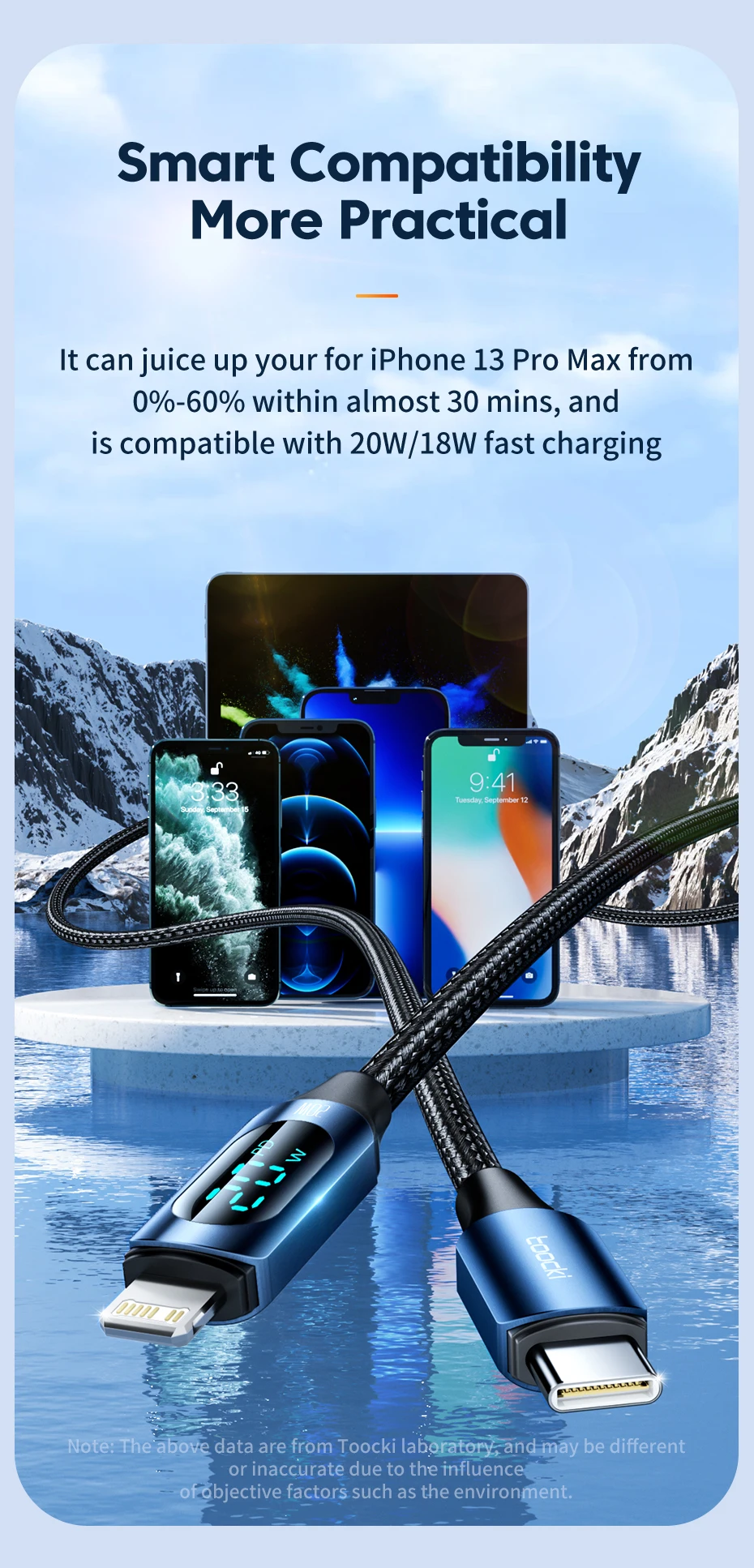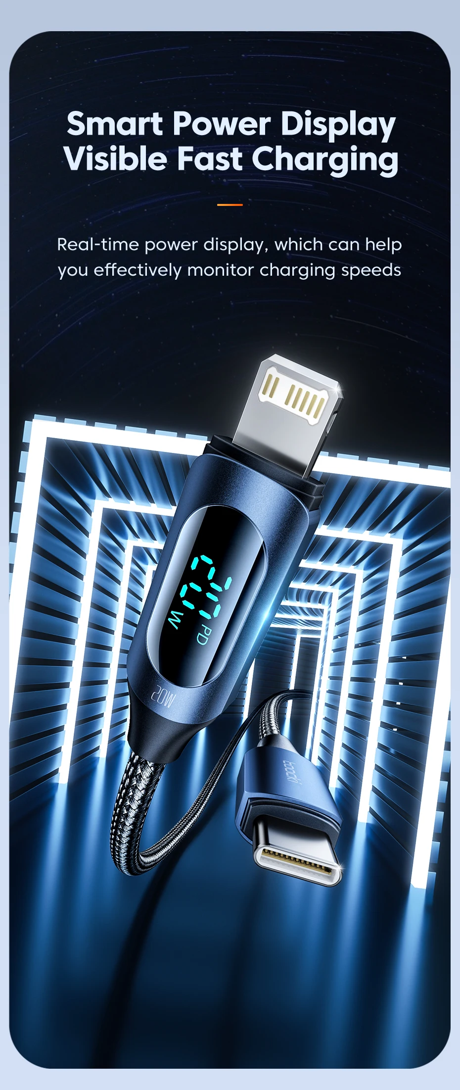 Smart Power Display PD 36W Fast Charging Data Cable,Real-time power display, which can help you effectively monitor charging speeds.Real-time power display, which can help you effectively monitor charging speeds.It can juice up for your iPhone 13 Pro Max from 0%-60% within almost 30 mins, and is compatible with 20W/18W fast charging.