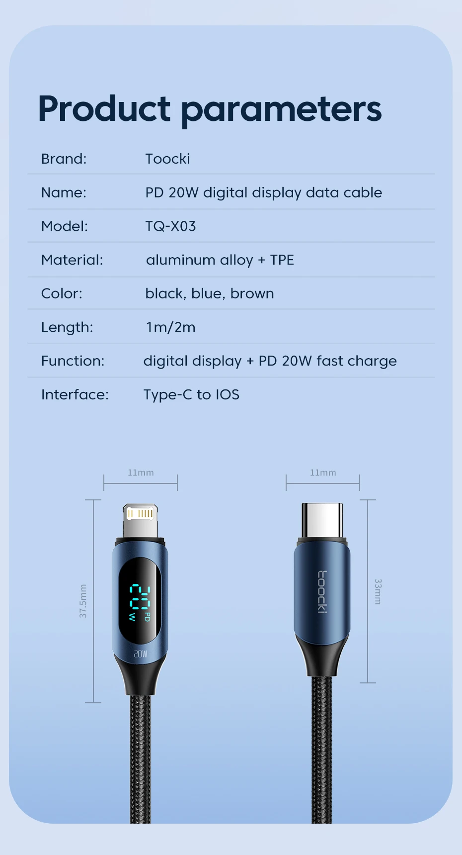 Product parameters Name: PD20W digital display data cable Material: aluminum alloy + TPE Color: black, blue, brown