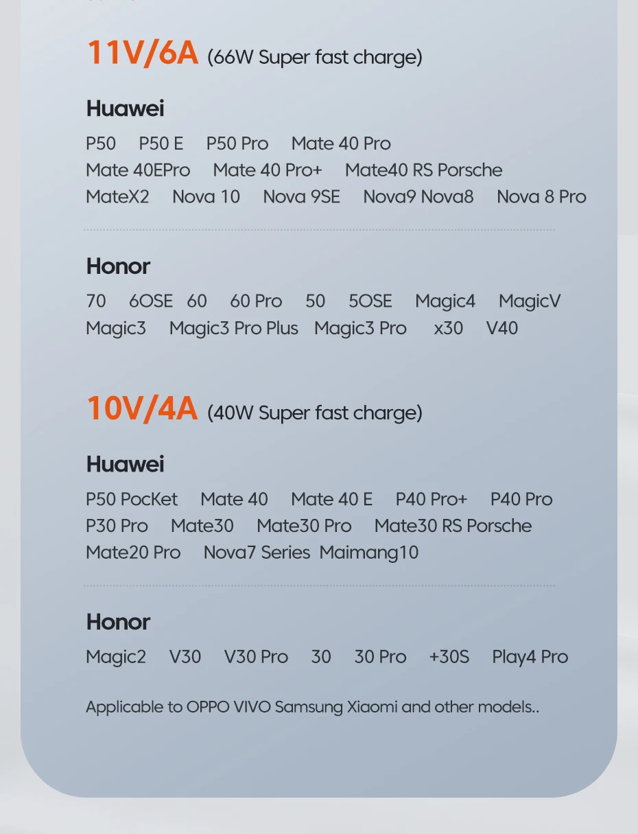 The data cable is compatible for Huawei (all series)fast charging systems, and is backward compatible with 11V/6A 10V/4A 4.5V/5A fast charging specifications.