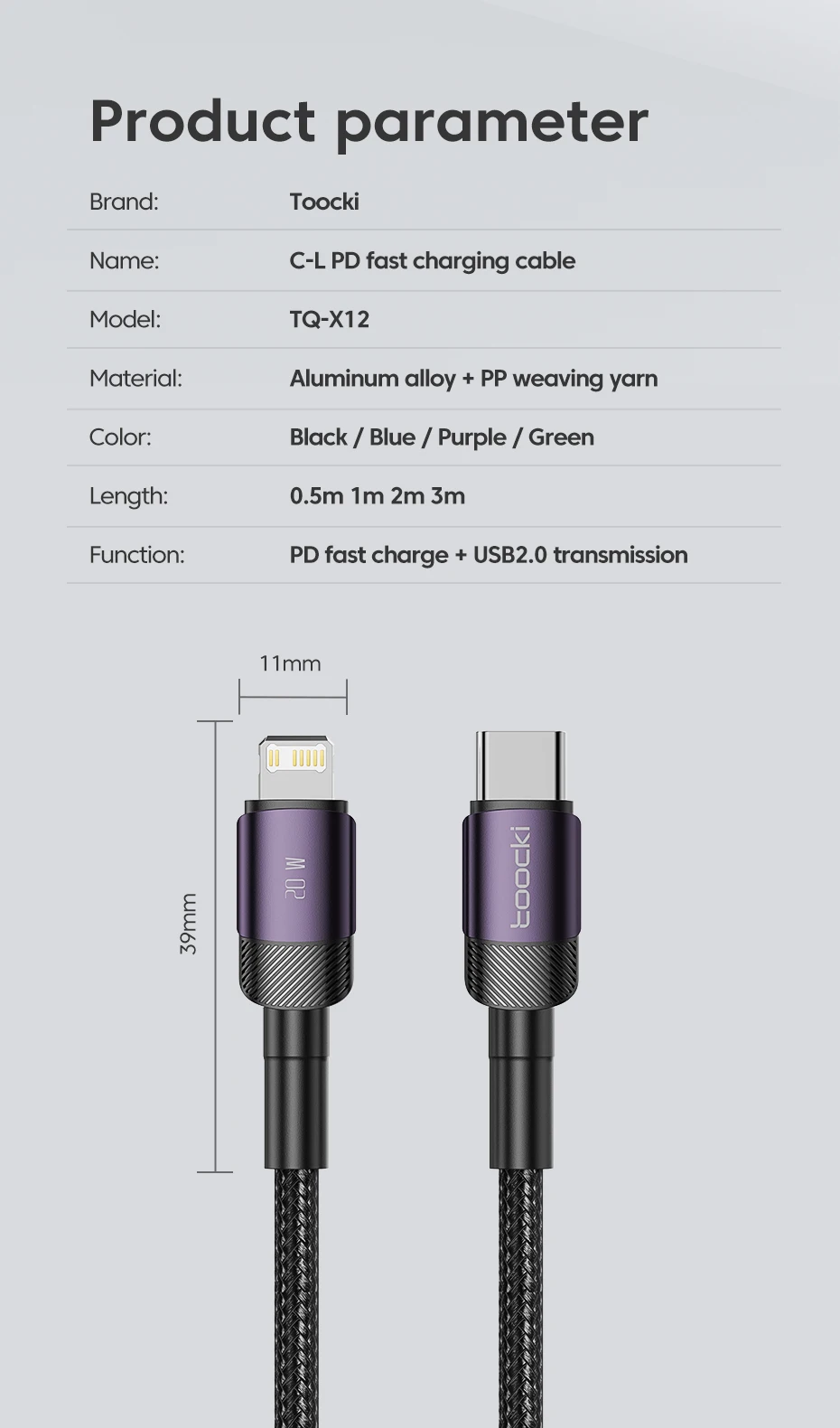 Name: C-L PD fast charging cable Material: aluminum alloy + PP weaving yarn