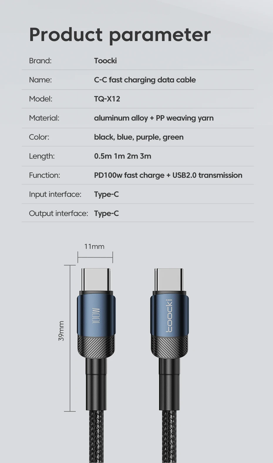 Name : 100W C-C fast charging data cable Material: aluminum alloy + PP weaving yarn