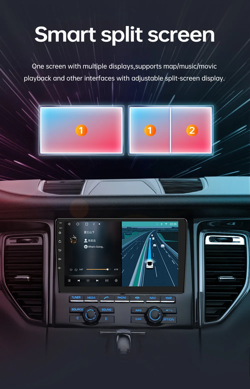 • Split screen function: Only supports music and navigation