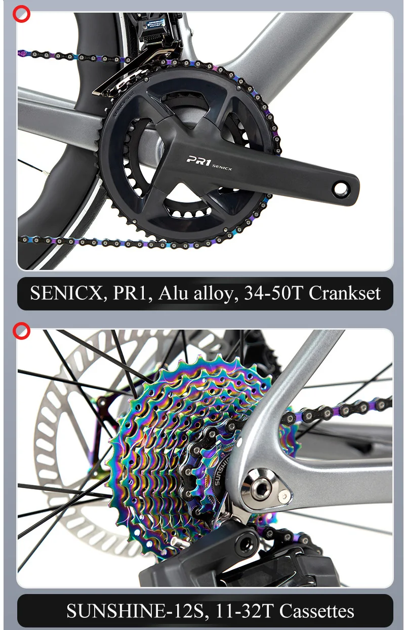 - Cranksets: SENICX, PR1 Alu alloy, Hollow, 34-50T