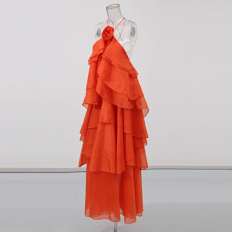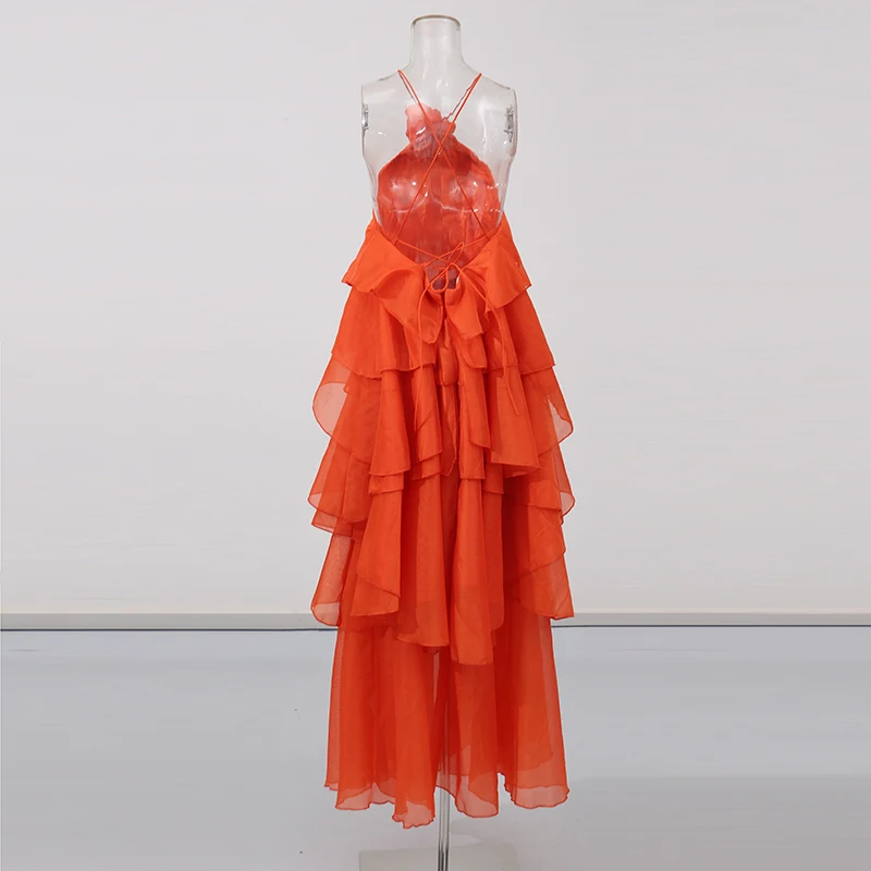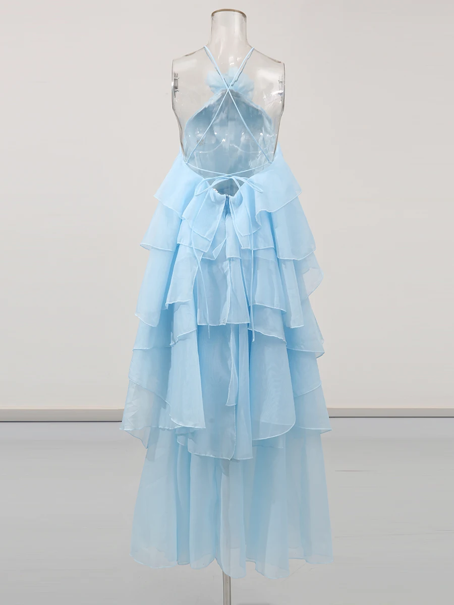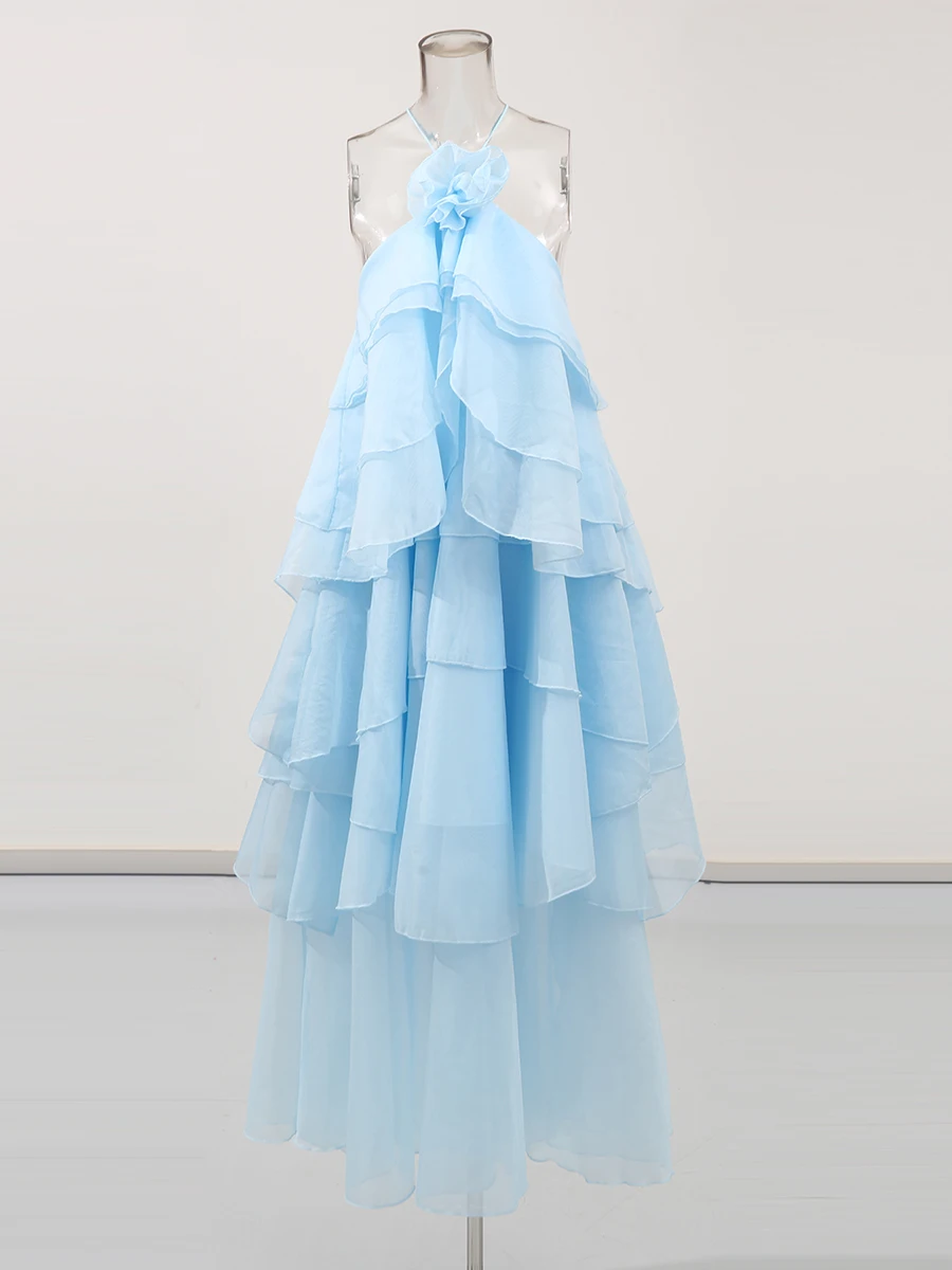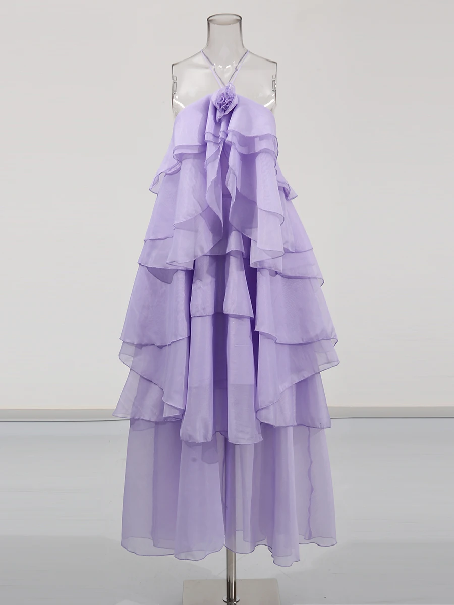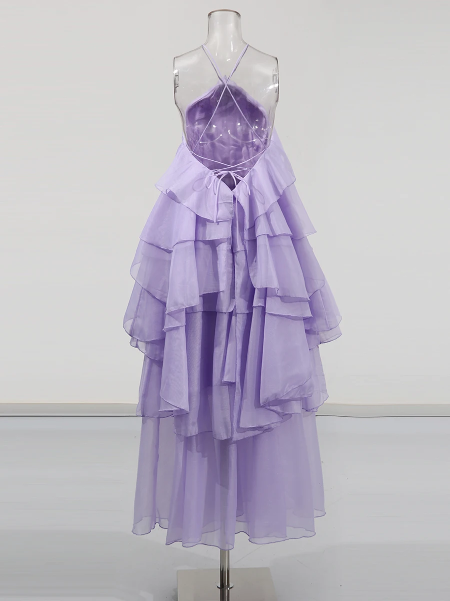 TWOTWINSTYLE Solid Spliced Ruffles Elegant Dresses For Women Halter Sleeveless High Wasit Backless Loose Dress Female Fashion