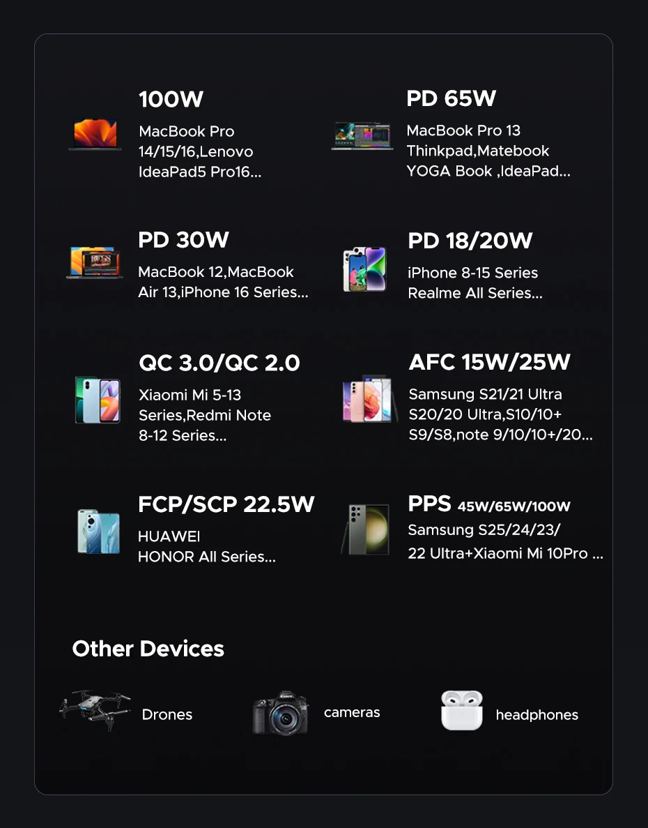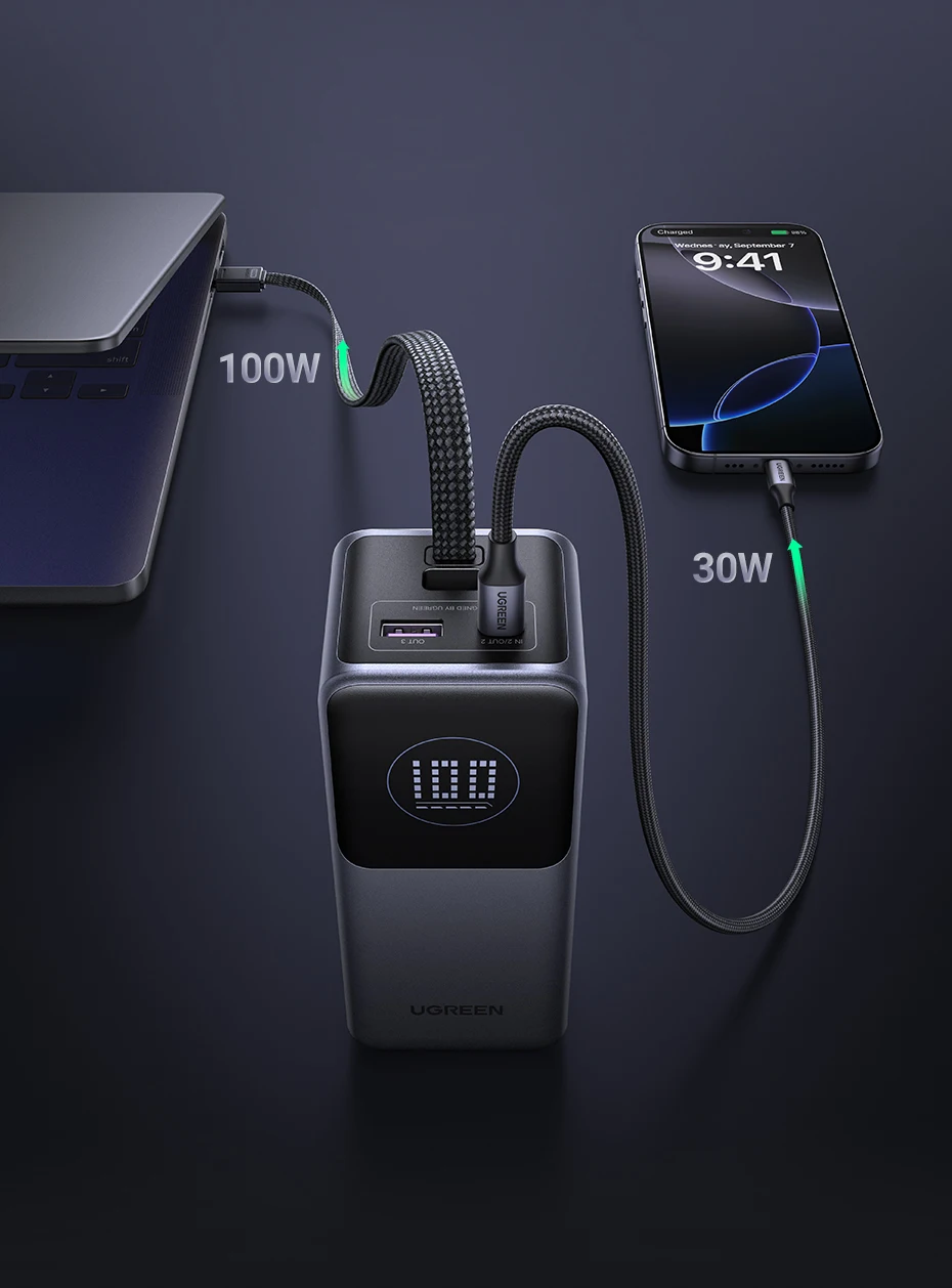 Fast charge 2 devices at the same time, 100W fast charging for the laptop and 30W fast charging for phone