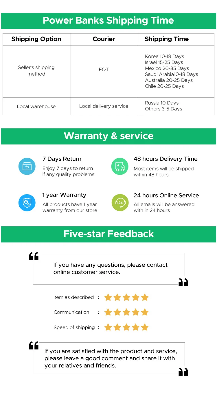 Tips: Regarding the transportation time of mobile powerbank, ignore the default delivery time shown in the system and refer to the following reference time. If you are not sure, please contact customer service.