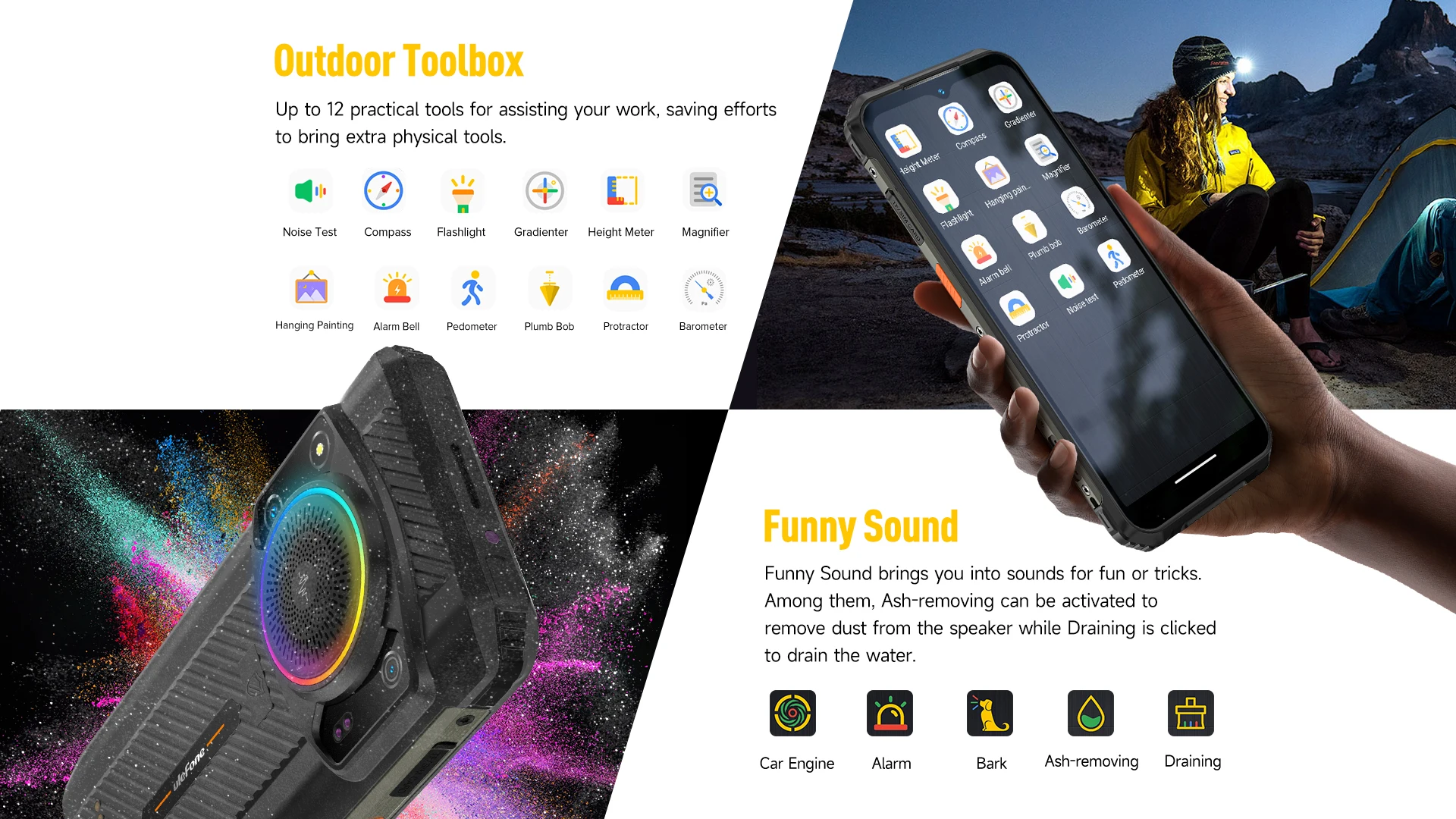 Compass, Gradienter, Flashlight, Hanging Painting, Height Meter, Magnifier, Alarm bell, Plumb bob, Protractor, Noise Test, Pedometer, Barometer