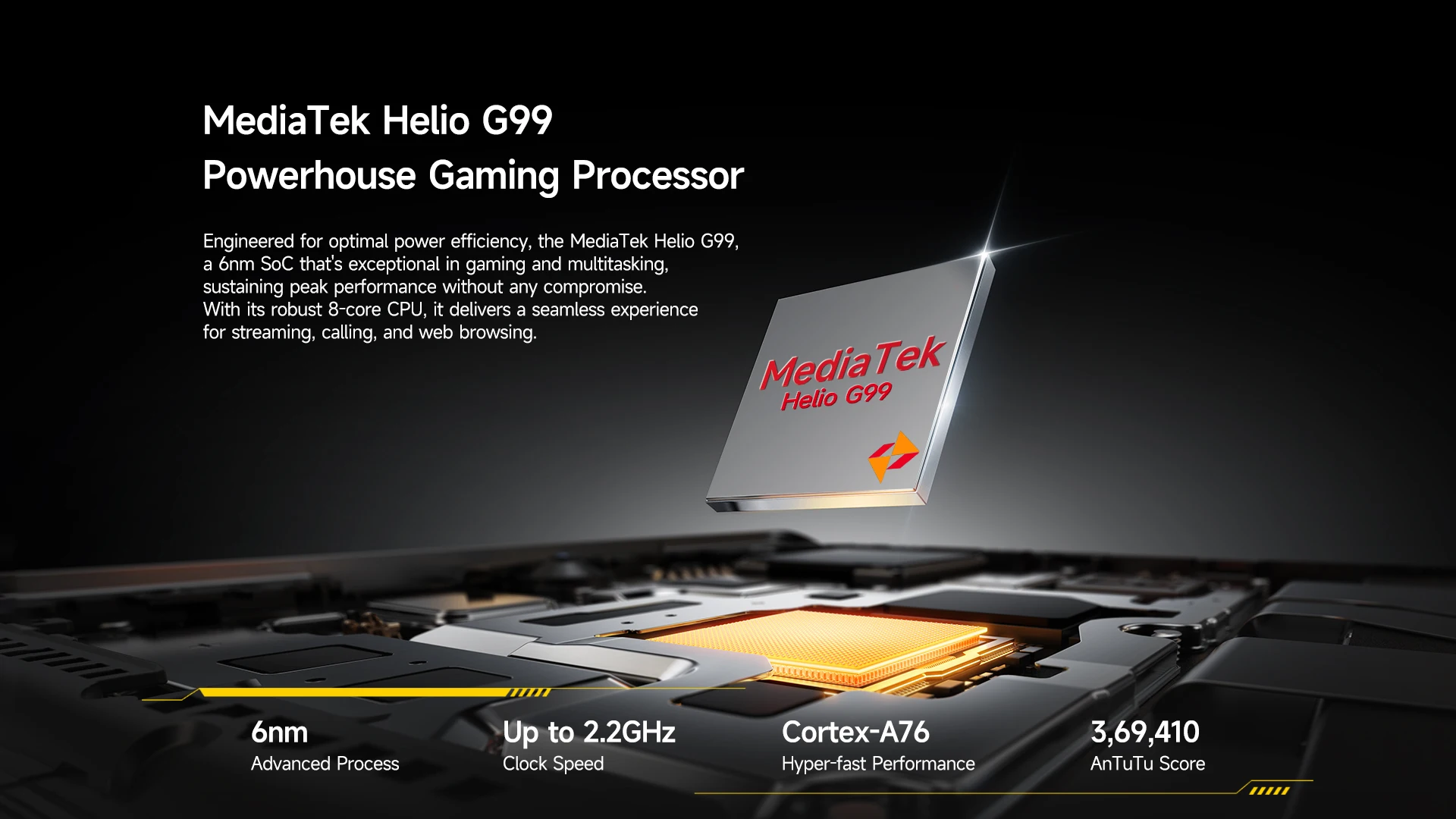 MediaTek Helio G99 ,2x Arm Cortex-A76 2.2GHz, 6x Arm Cortex-A55 2.0GHz |