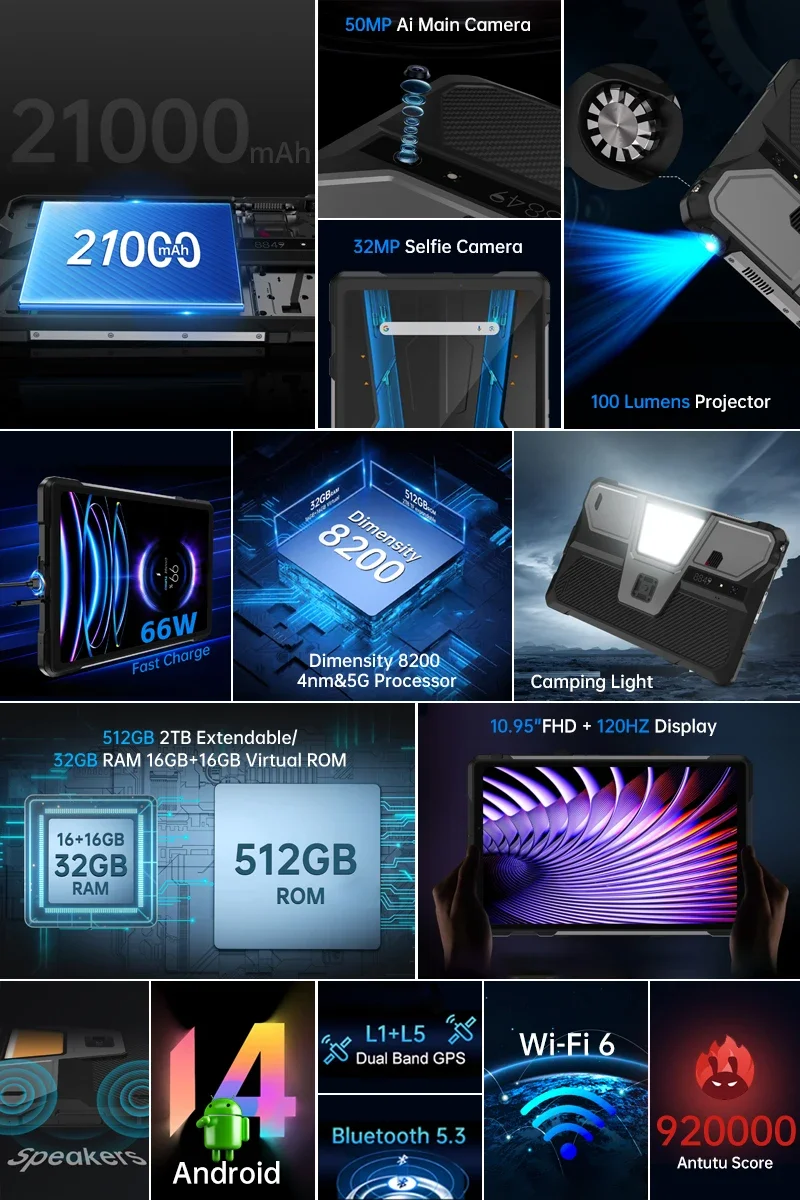 Unihertz 8849 TANK PAD Rugged Projector Tablet 10.95 Inch Smartphone Android 14 120Hz 16GB 512GB 21000mAh 50MP 66W Tablets PC