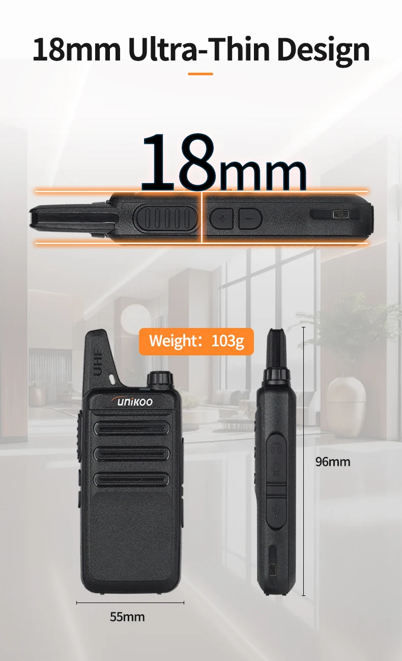 Measuring only 18mm thick, the UK234 ultra slim walkie talkie redefines portability.
