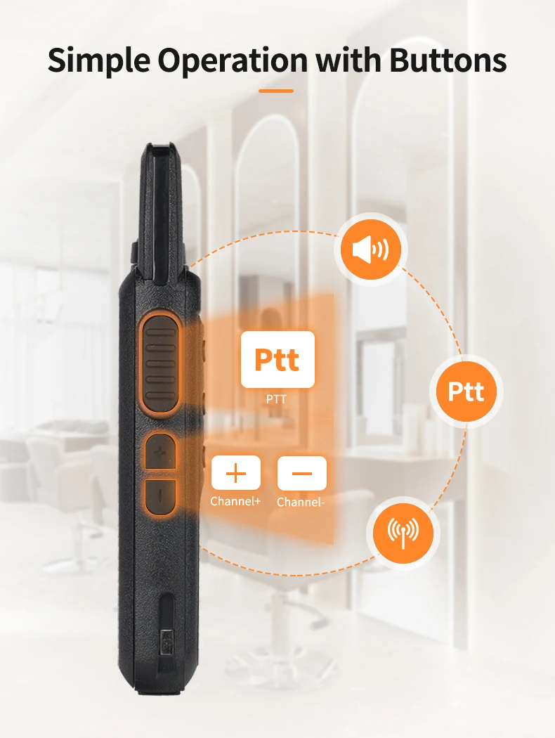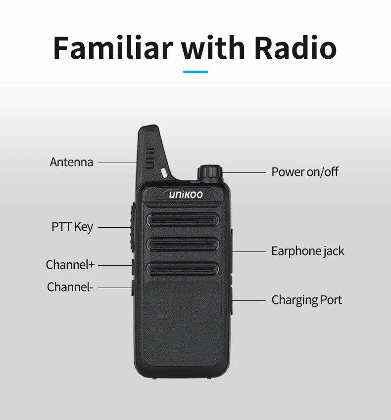 Unlike most other license-free walkie talkies,UK234 only has 3 keys to operate. PTT KEY and Two Side Keys.