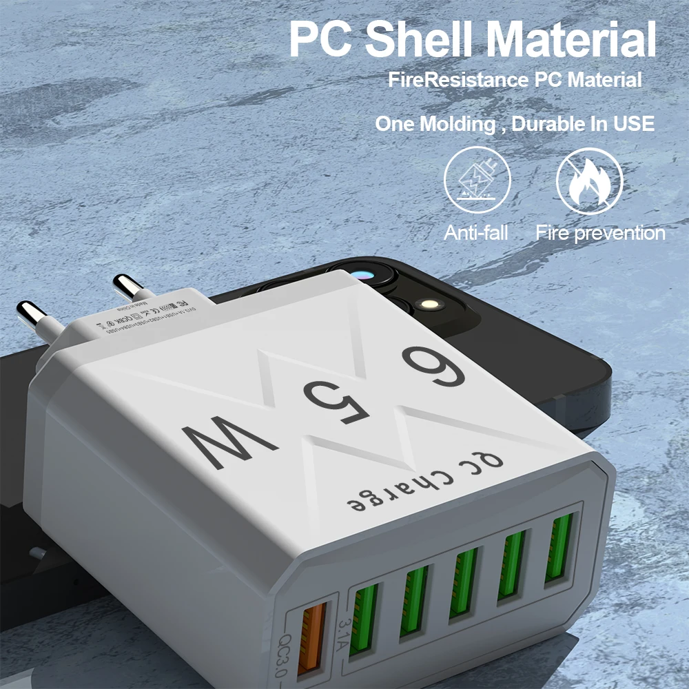 USB Charger 6 Ports Total 65W Fast Charging 3.0 Wall Travel Charger For iPhone Samsung Xiaomi Mobile Phone Adapter EU KR US Plug