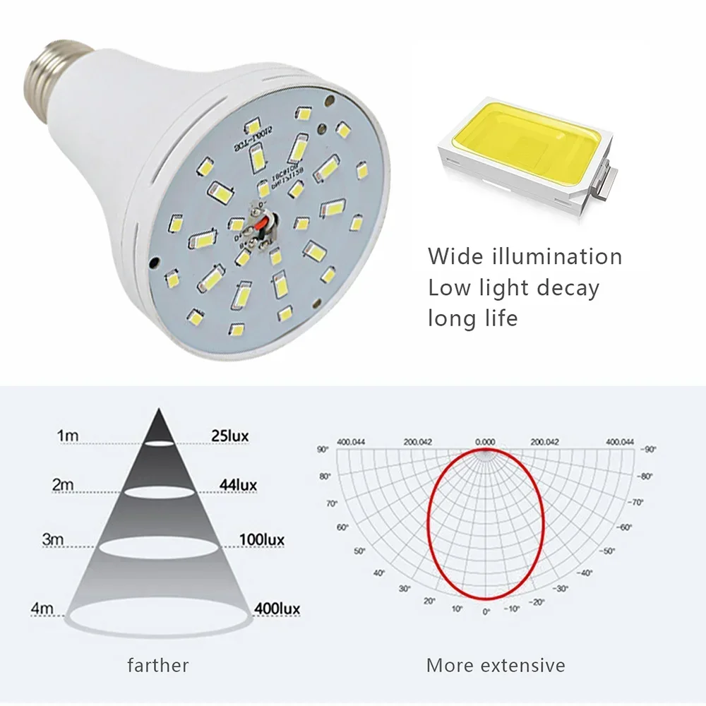 4. The built-in battery can be recharged in high temperature lighting conditions and if charged for 8-10 hours, the bulb will provide 3-5 hours of continuous illumination after a power failure.