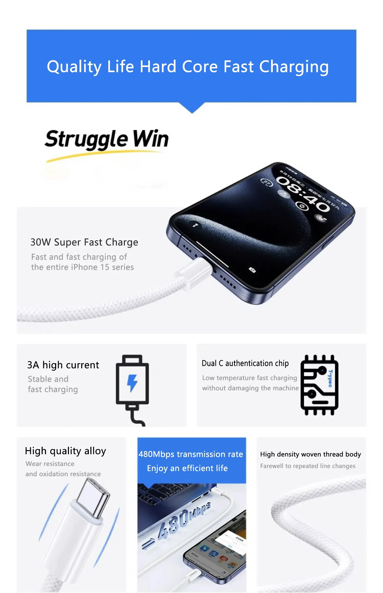 USB-C Cable For Apple iPhone 15 Pro Max PD 60W Fast Charging For Huawei Xiaomi Samsung Type C Weaving Cable Accessories