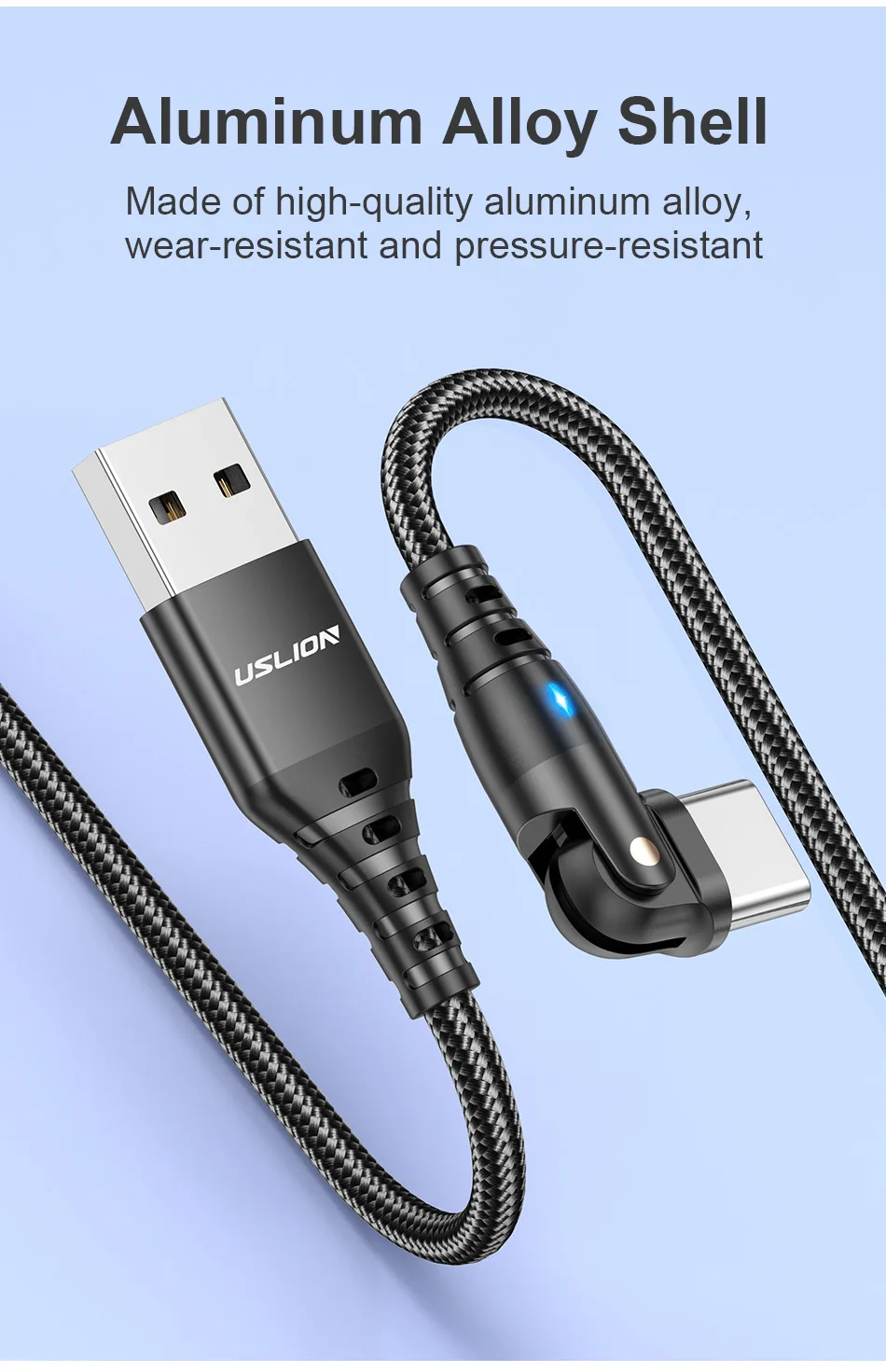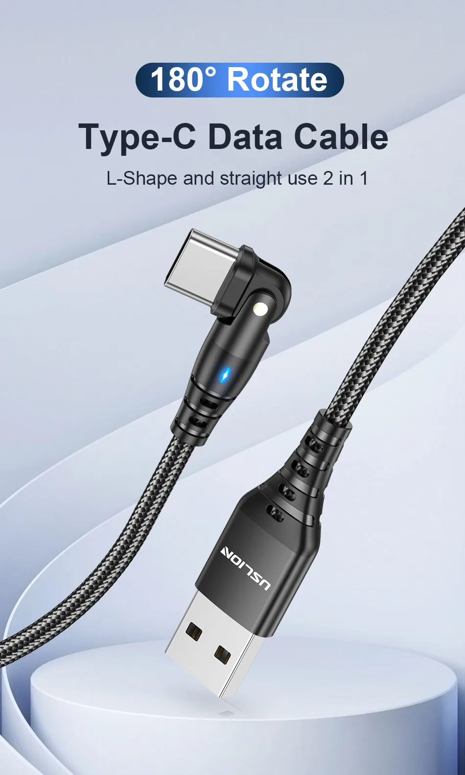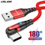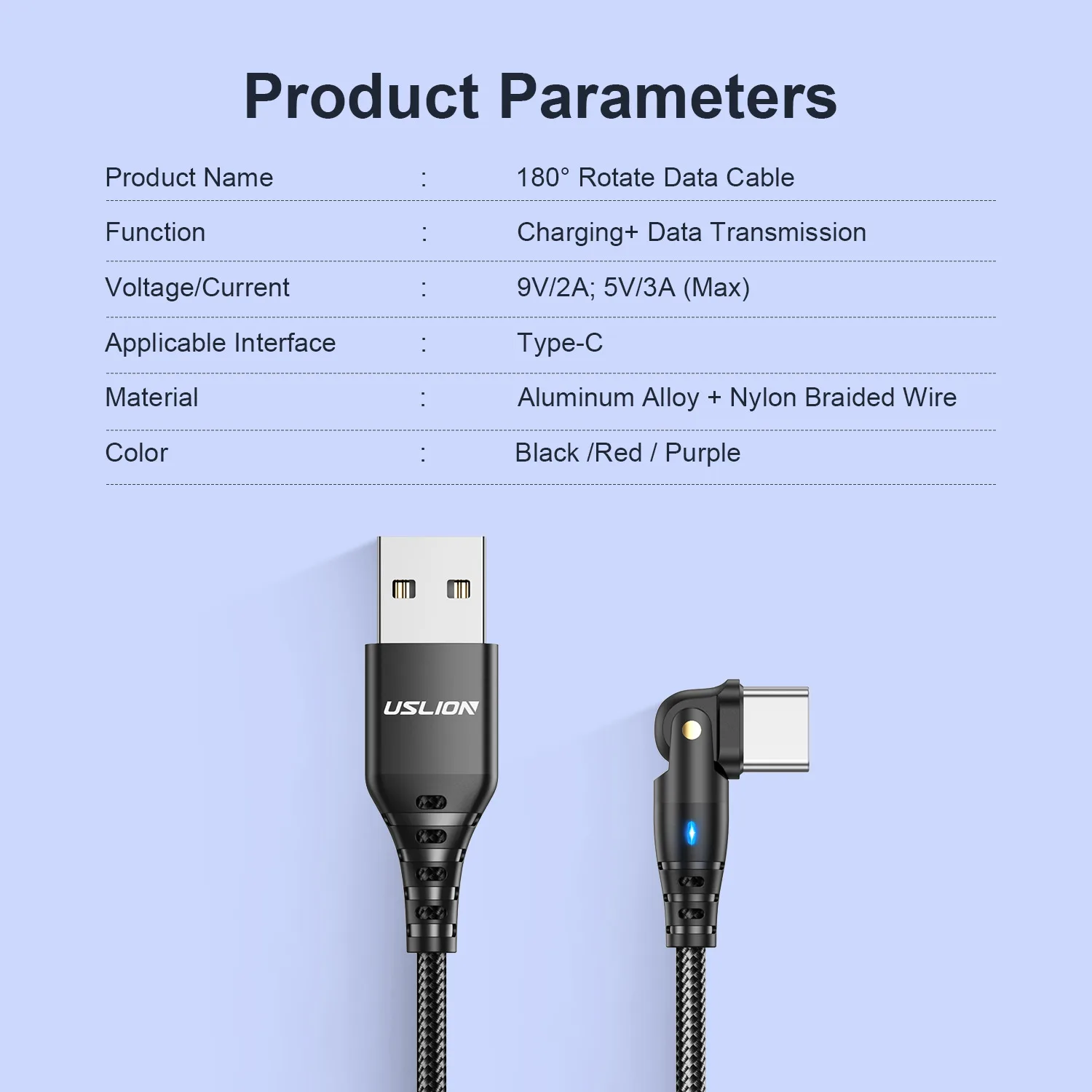 USLION Red Type C Cable 180 Rotate 3A Fast Charging Wire For Samsung Xiaomi Mobile Phone USB C Cable Type C Charger Data Cables