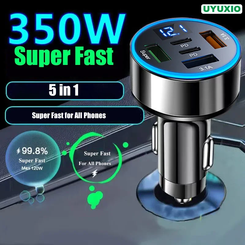 UYUXIO 5 in 1 USB Car Phone Charger Adapter with Voltage Display Dual PD Port Super Fast Charge for iPhone Samsung Huawei OPPO