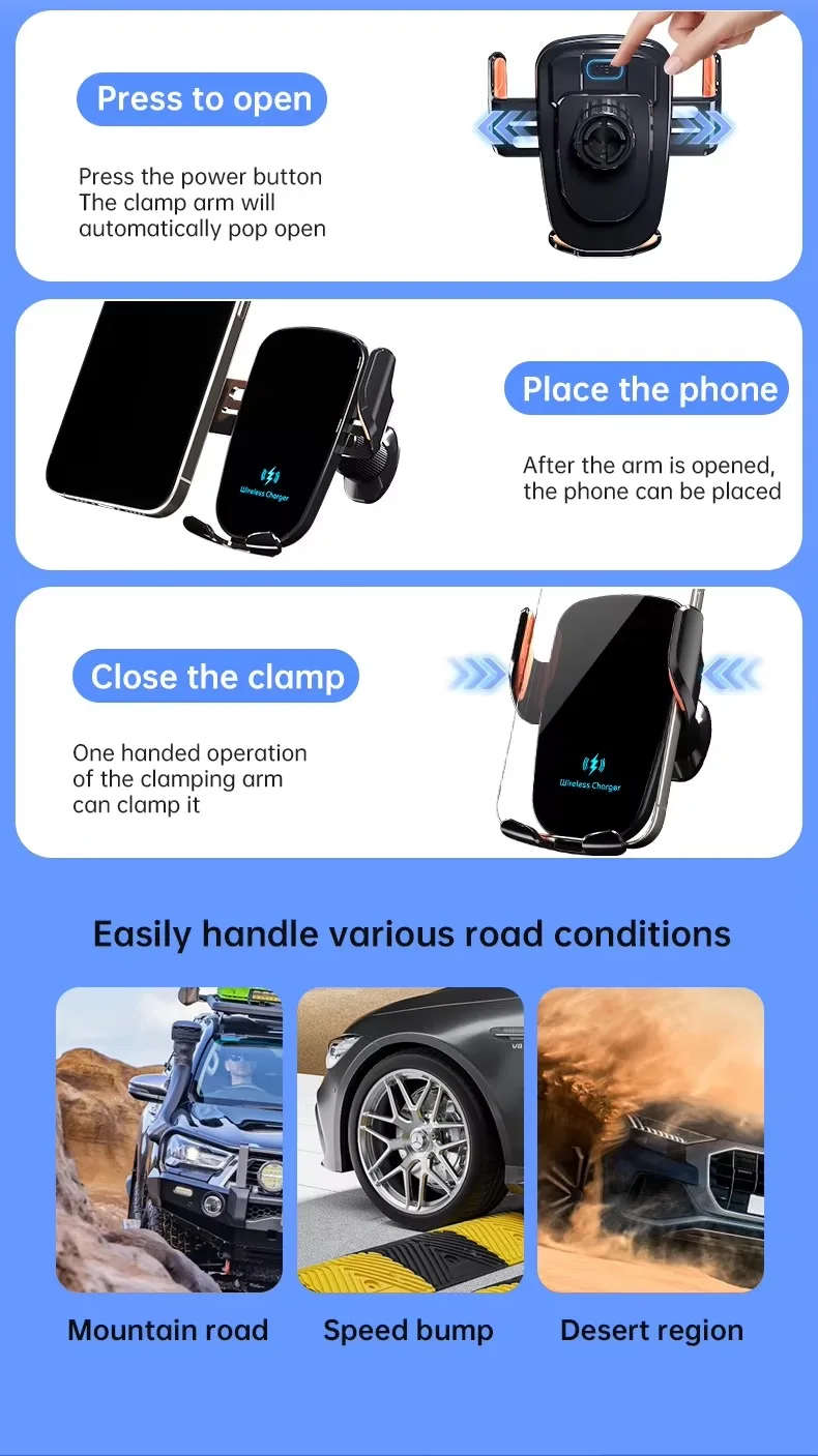 UYUXIO Manual Clamp Wireless Car Charger 15 Fast Charging Air Vent Car Mount Phone Holder for iPhone Samsung Android Phone