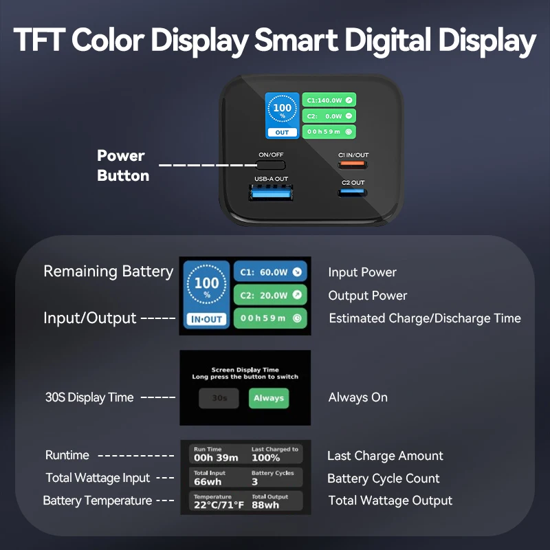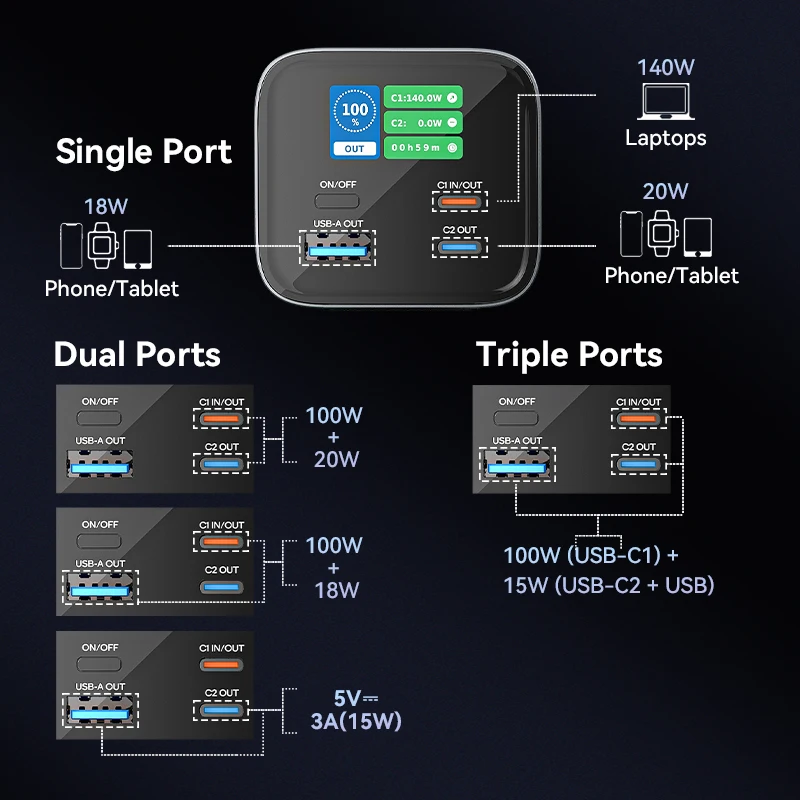 Output: USB-C1 + USB-C2 + USB-A: 100W + 15W