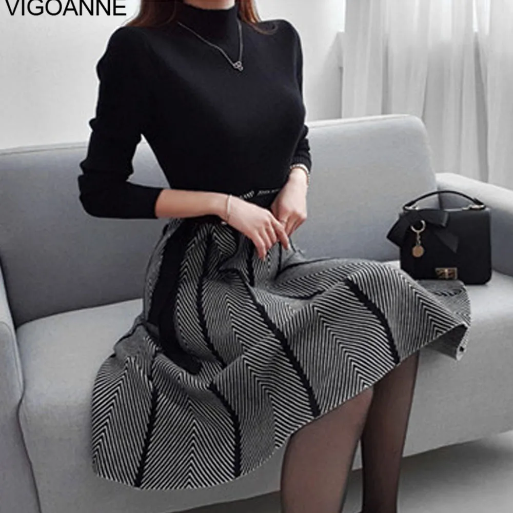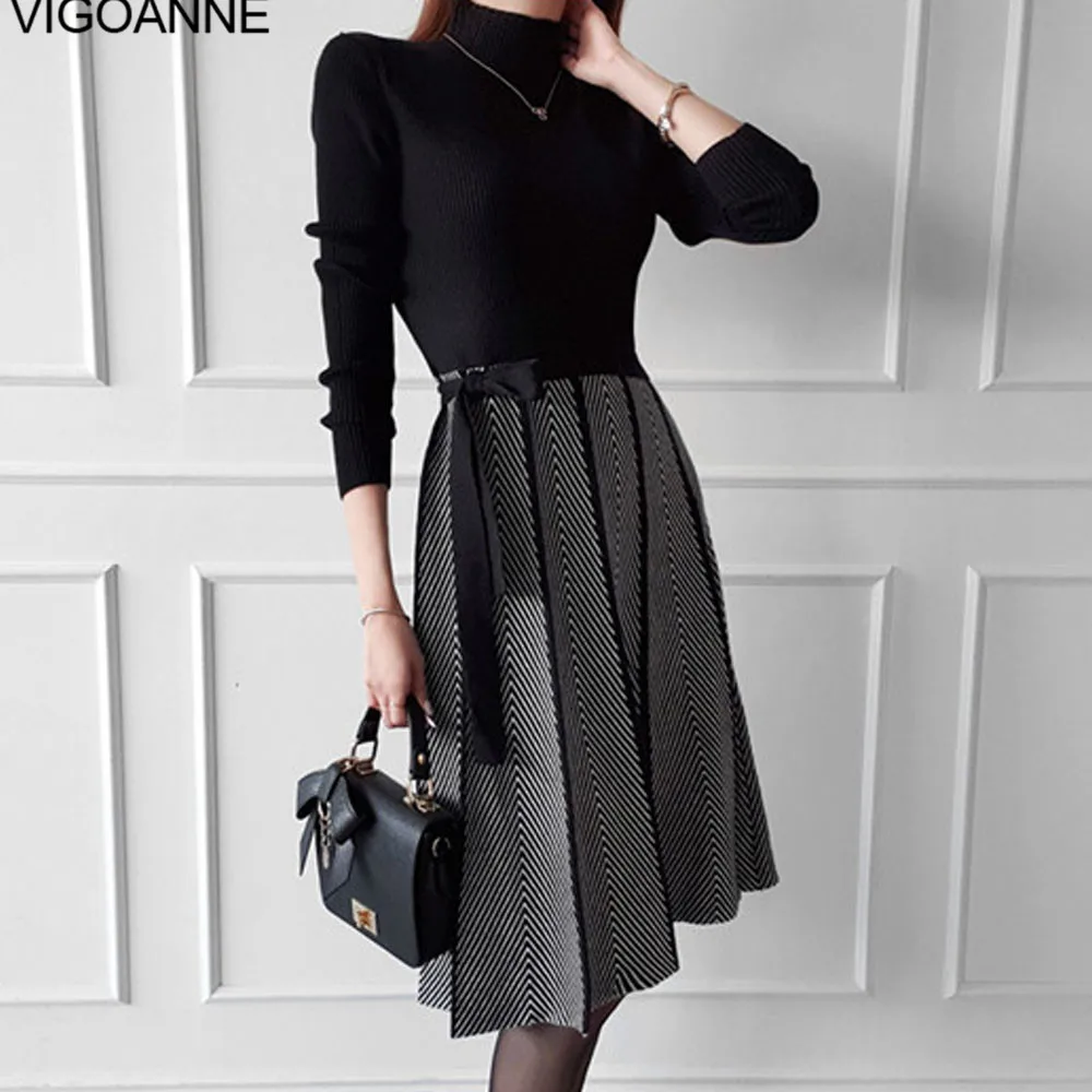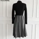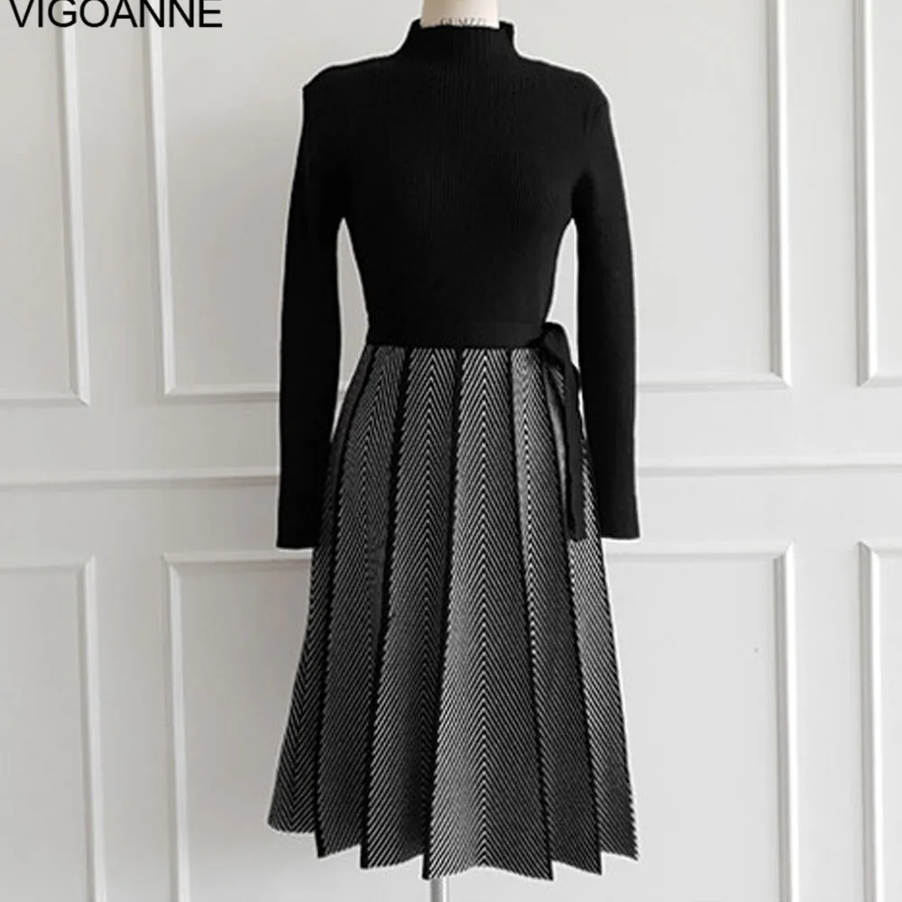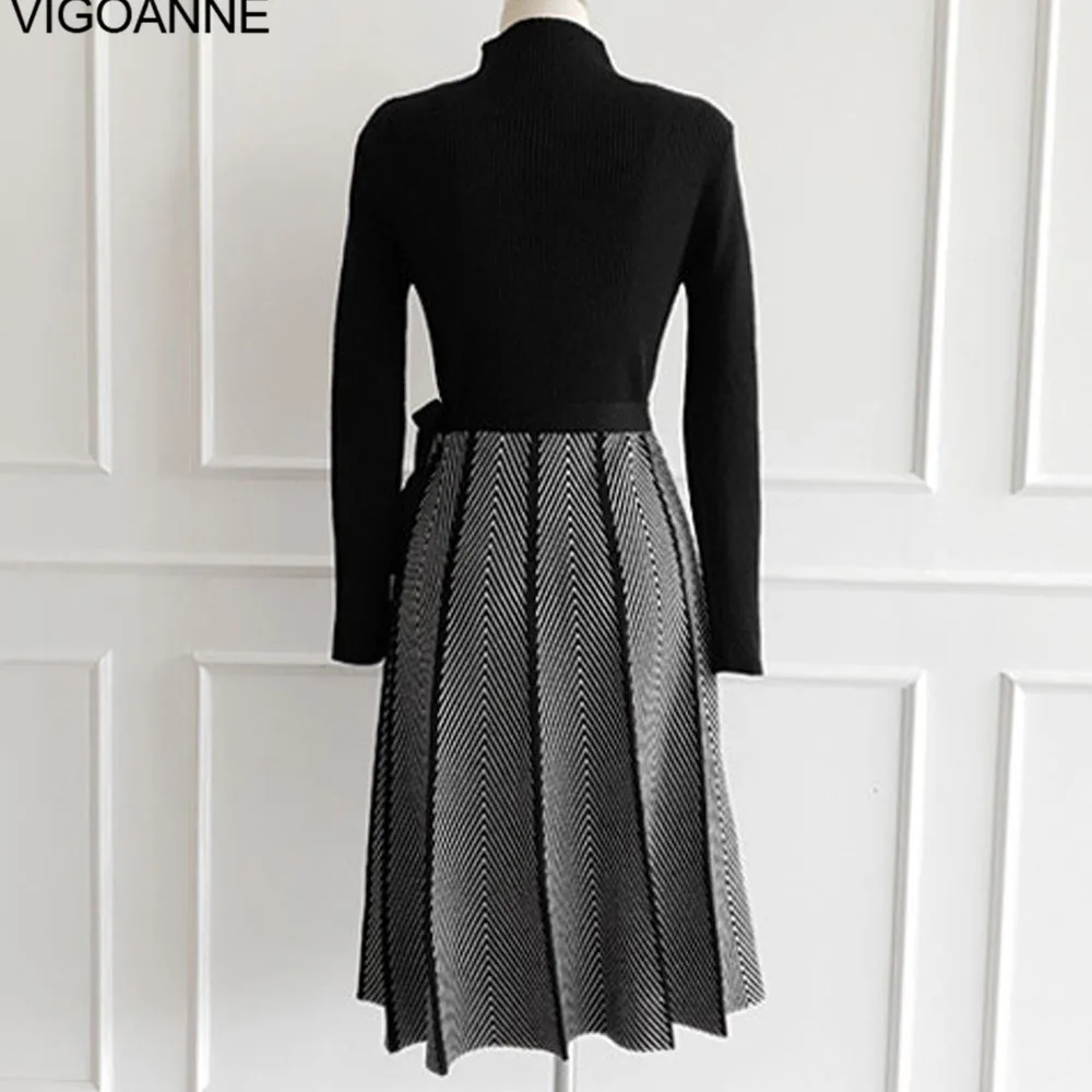 VigoAnne 2025 Woman Black Patchwork Knit Dress Spring Autumn Long Sleeve Korean Dresses Lady Evening Party Tight Long Dress