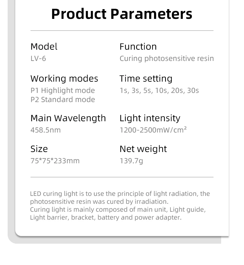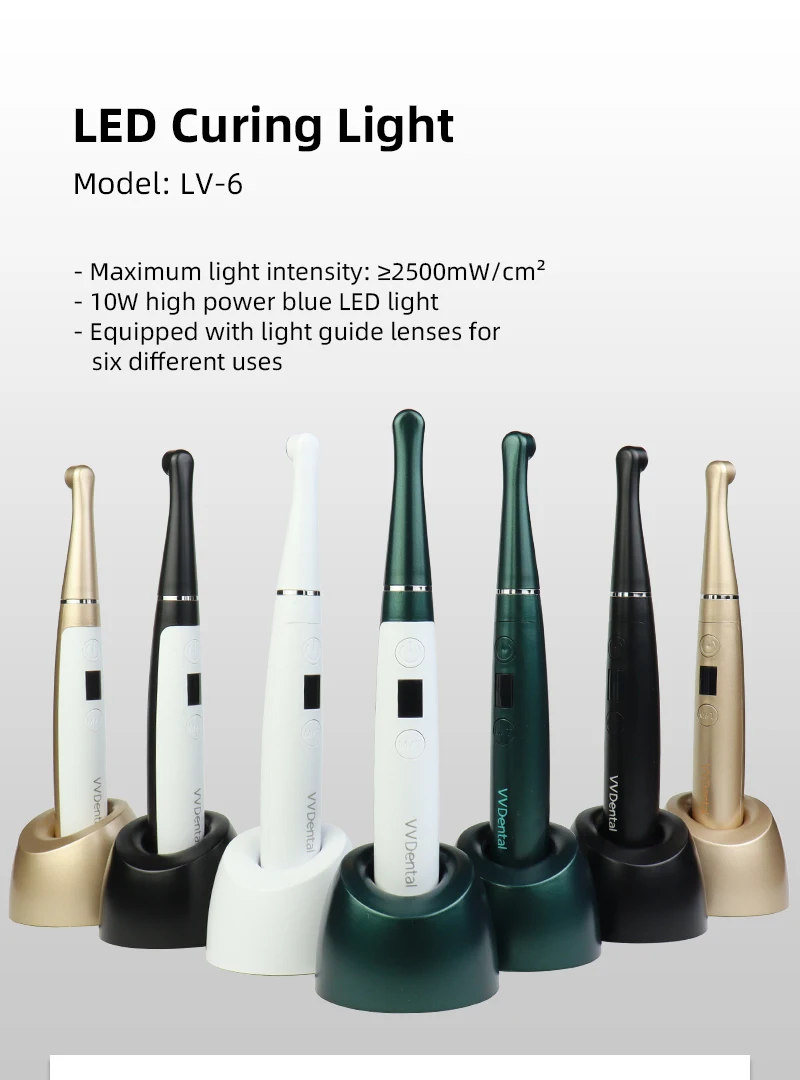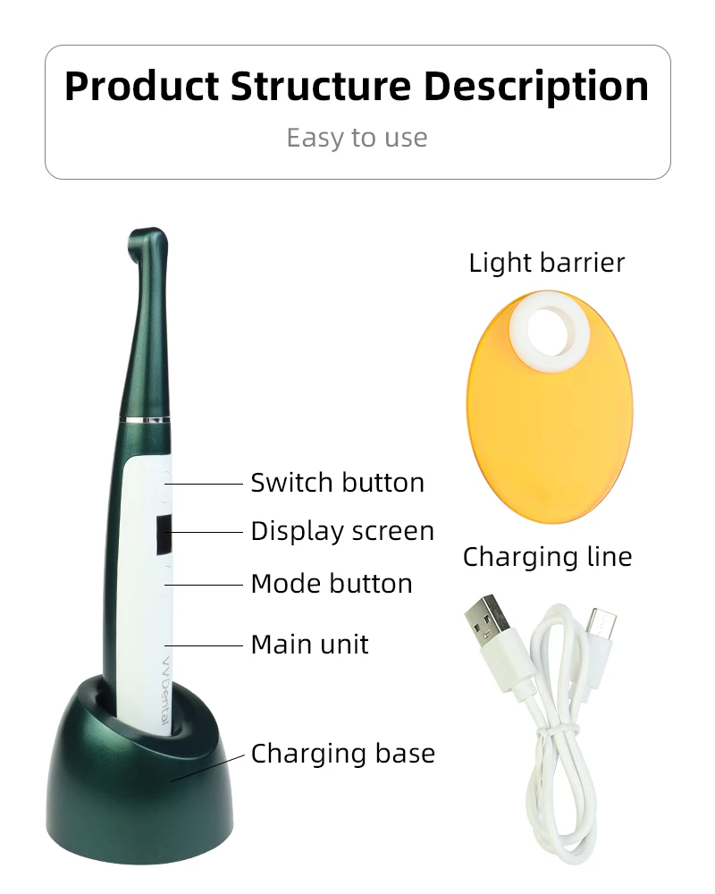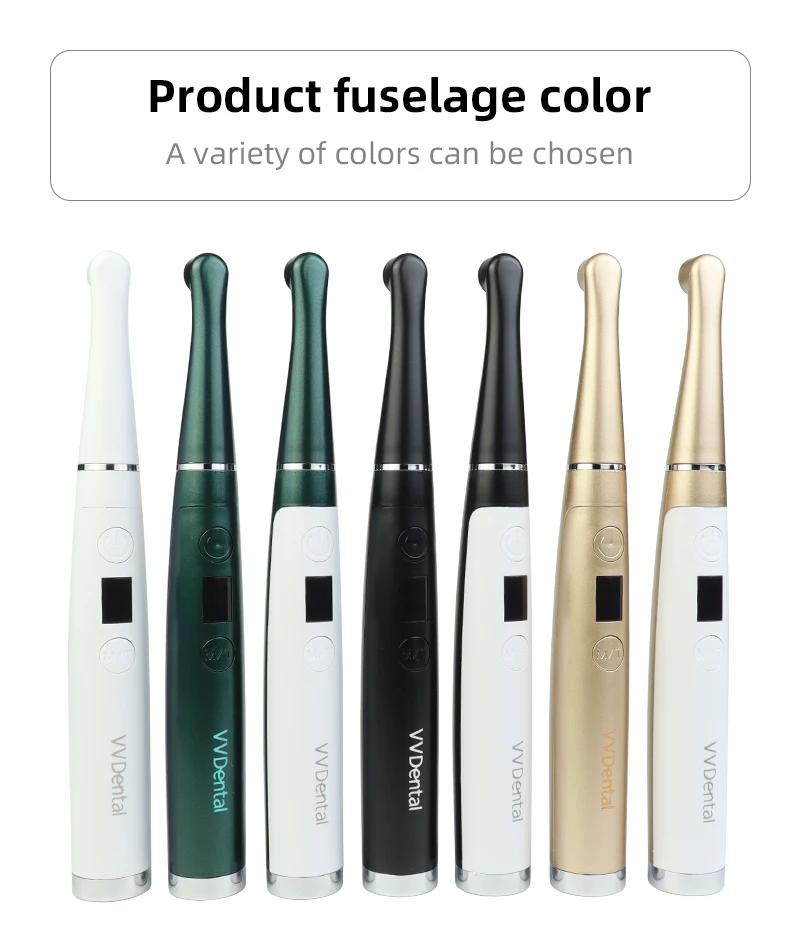 Segmented design: detachable magnetic lamp head, which can be rotated 360° to cure upper and lower teeth.Equipped with six magnetic light tubes: the red and green light heads can observe the spots on teeth in more detail, and the extended tube light head is suitable for curing between teeth or narrow tooth gaps, and curing of tooth roots.