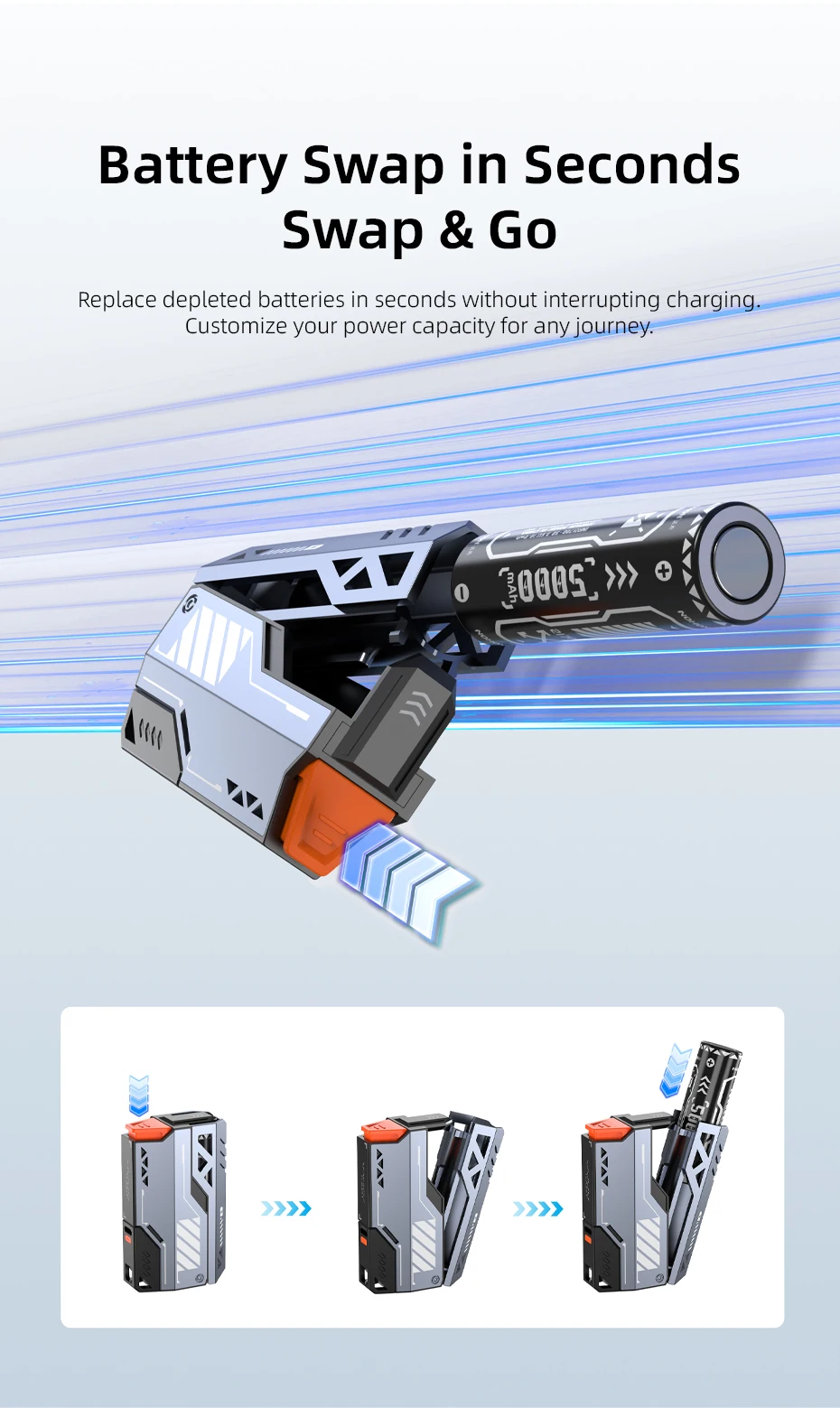 Revolutionary slide-and-lock mechanism ensures seamless battery swaps.Never run out of power again.