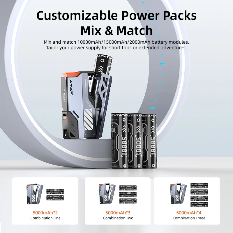 Mix and match 10000mAh/15000mAh/2000mAh battery modules.