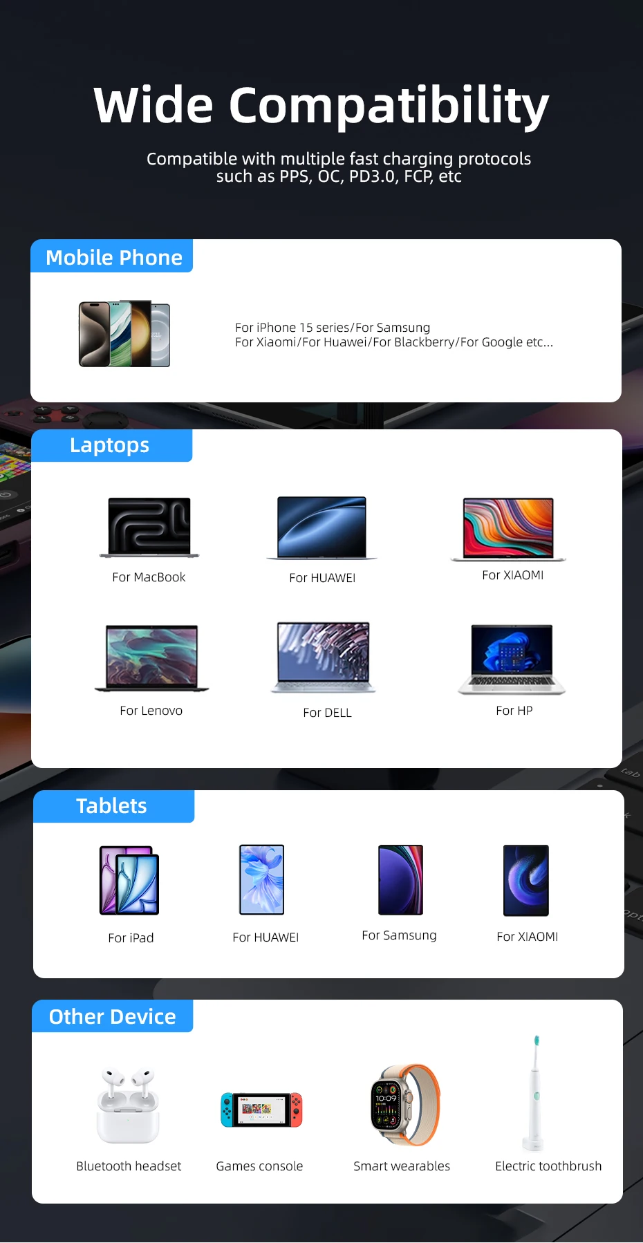 Compatible with multiple fast charging protocols such as PPS, OC,PD3.0,FCP etc